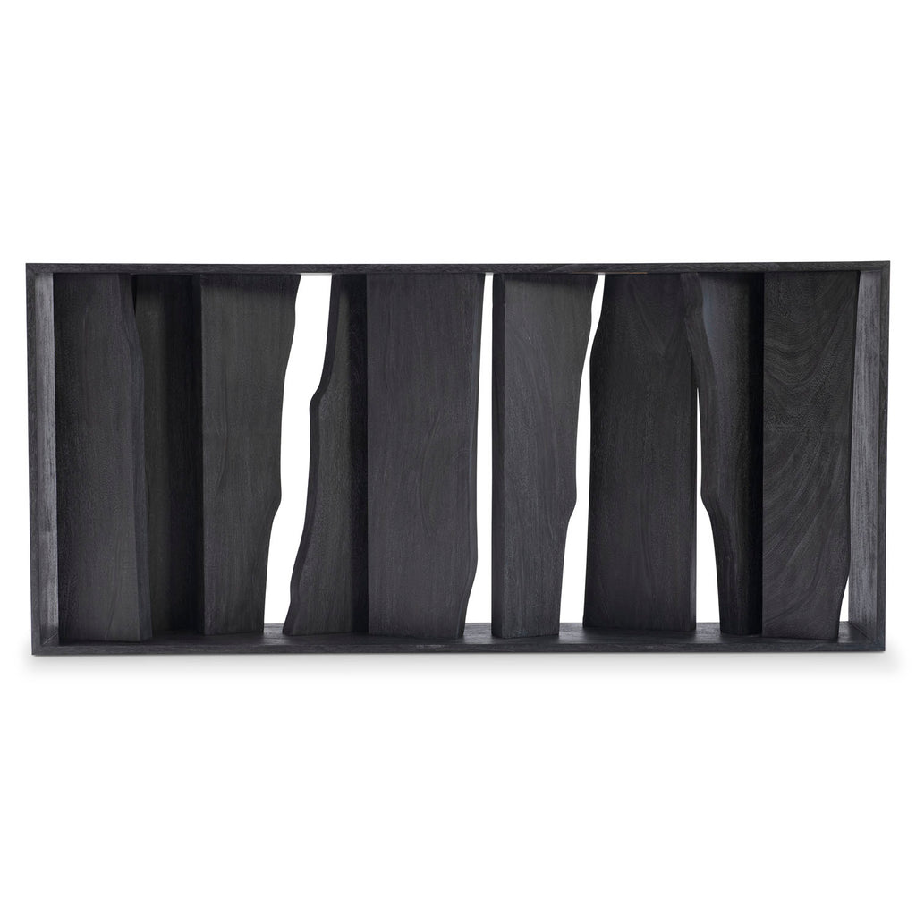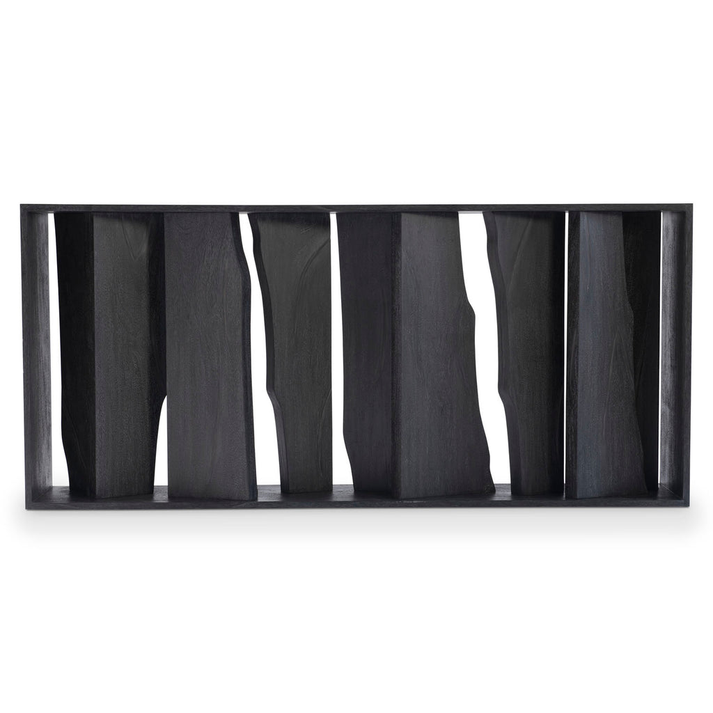 An elemental style crafts a unique table design for the Neff console. Nine organic shapes placed randomly within a frame create a mirage of light through the trees. The suar wood table is finished in a dark Flint Grey.