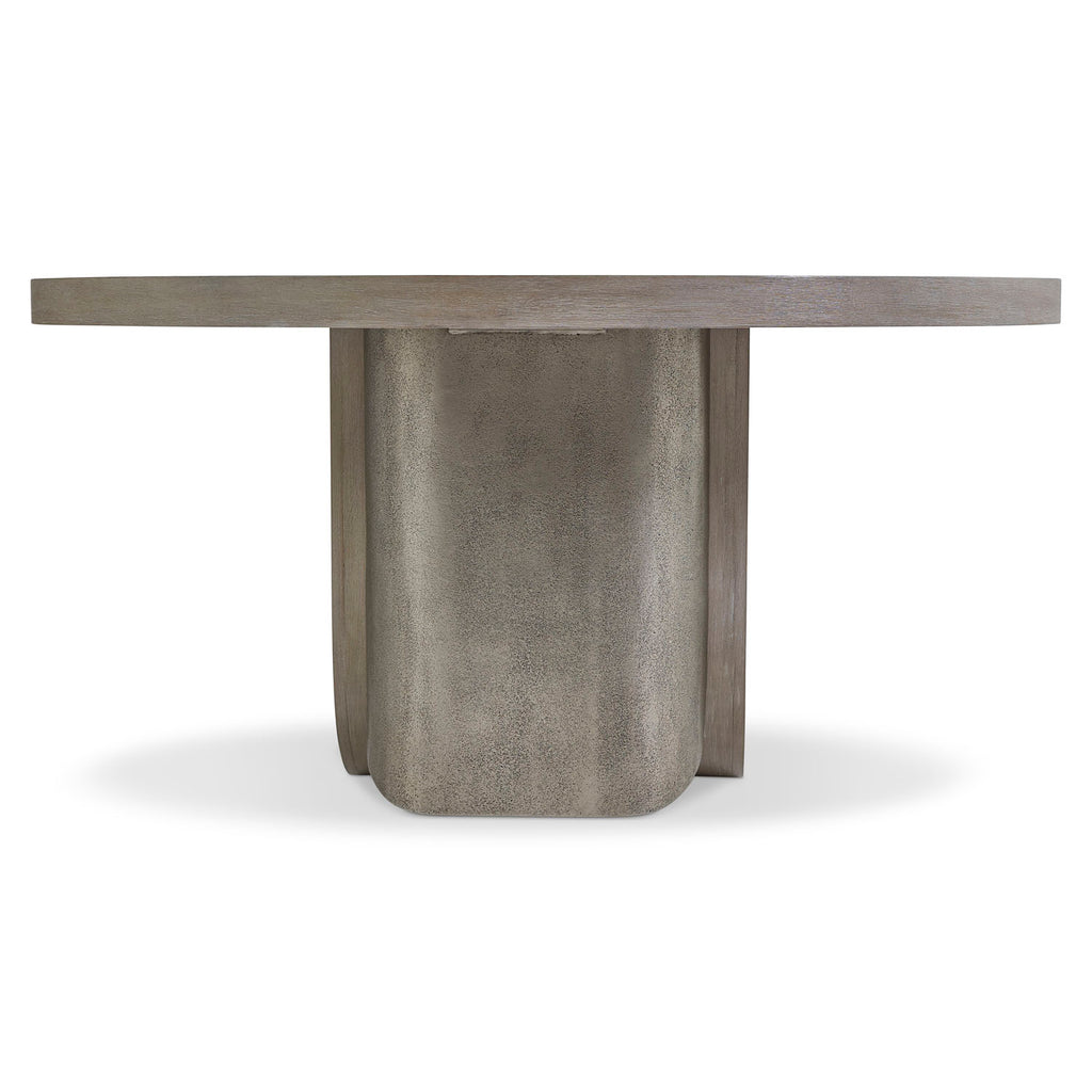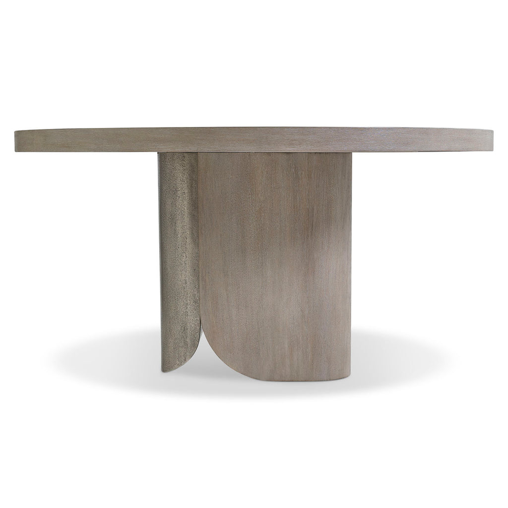 The Nexus dining table finds its perfect balance with metal and wood forms. Mahogany crafts one side of the base with a cut-away column that finds support from a thinner cast aluminum shape on one side. The wood form, including a round top, is finished in Forry with the metal finished in Graphite.