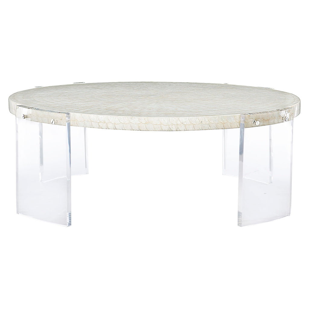 The Pearle cocktail table offers a unique material story, blending capiz shell with acrylic for a singular look. The luminescence of the shells lends a glamorous mystique, while clear leg panels with bright metal hardware bring a sleek, contemporary edge. Casual elegance and modern style meet in this breathtaking piece.