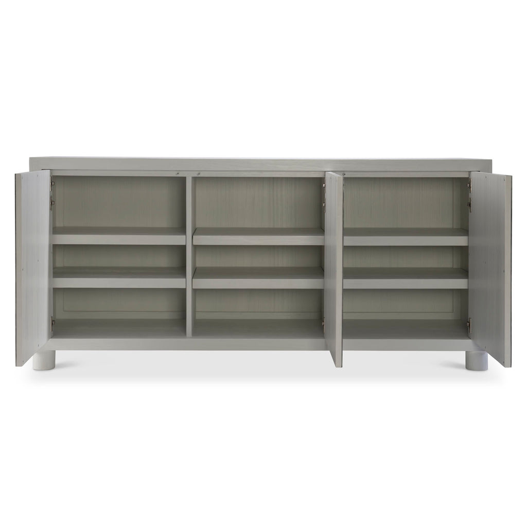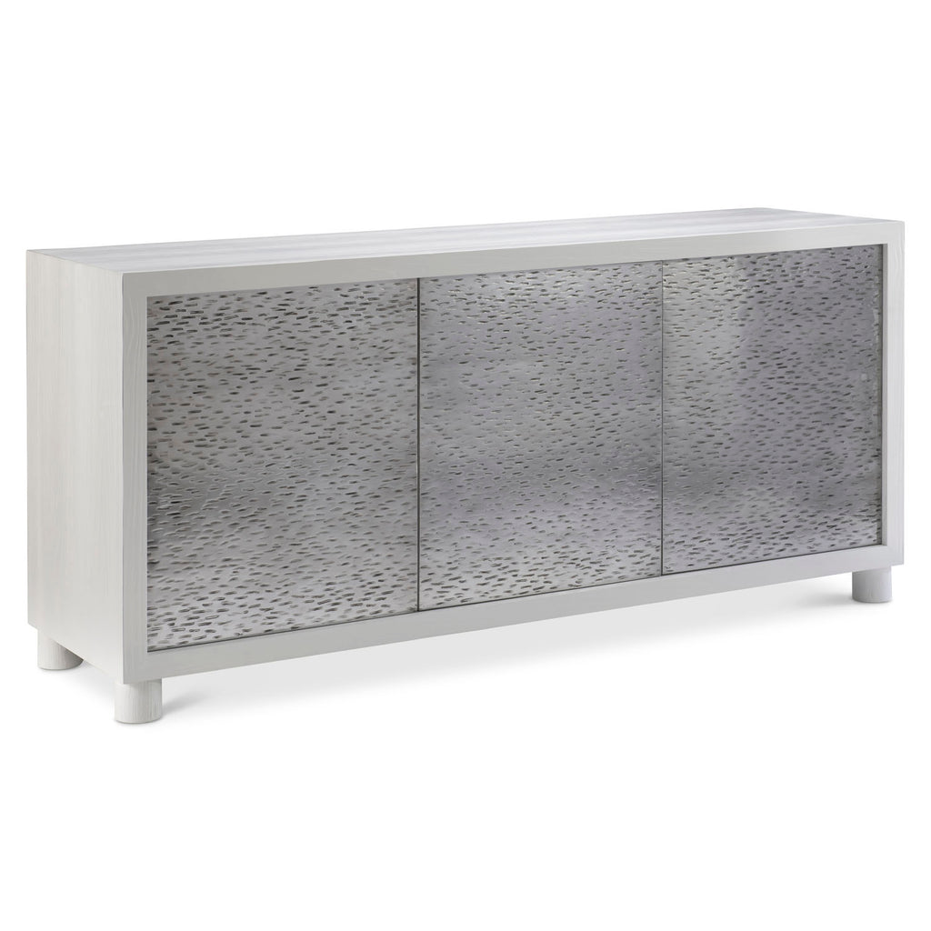 The Slater buffet has beautifully textured metal overlays that offer a pebbled look on its three push-to-open doors. The polished aluminum finished in Silver Cloud gleams against the wood frame in a pale Azucar finish. Interior storage includes six adjustable shelves.