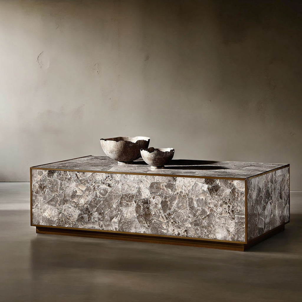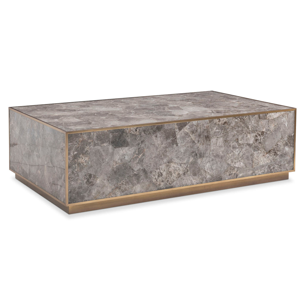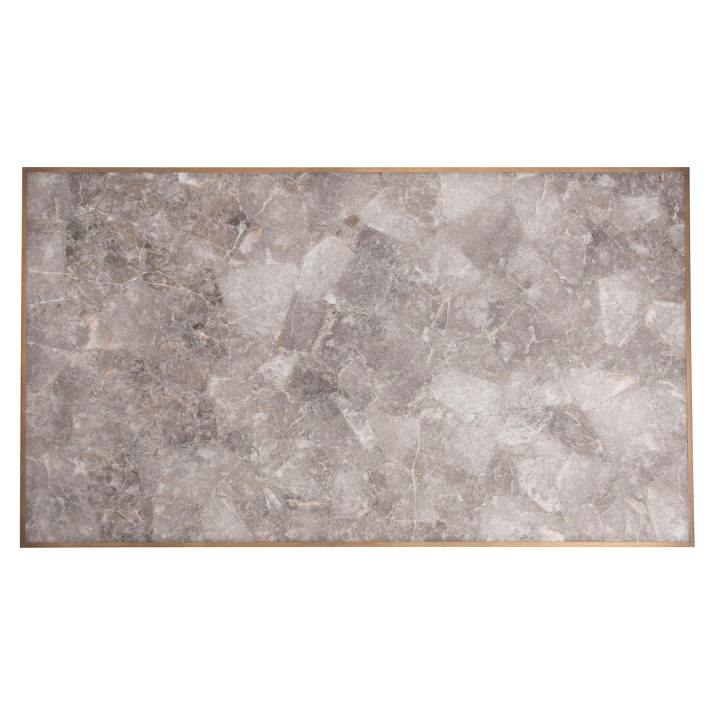 Natural panels of stone are encased in sleek metal on the Tildon cocktail table, defining an organic look that’s elevated and distinctive. Smoky quartz is framed by stunning brass, with the bold rectangular form resting on a plinth base. The glam factor is increased with our gorgeous Aged Brass finish on the metal.