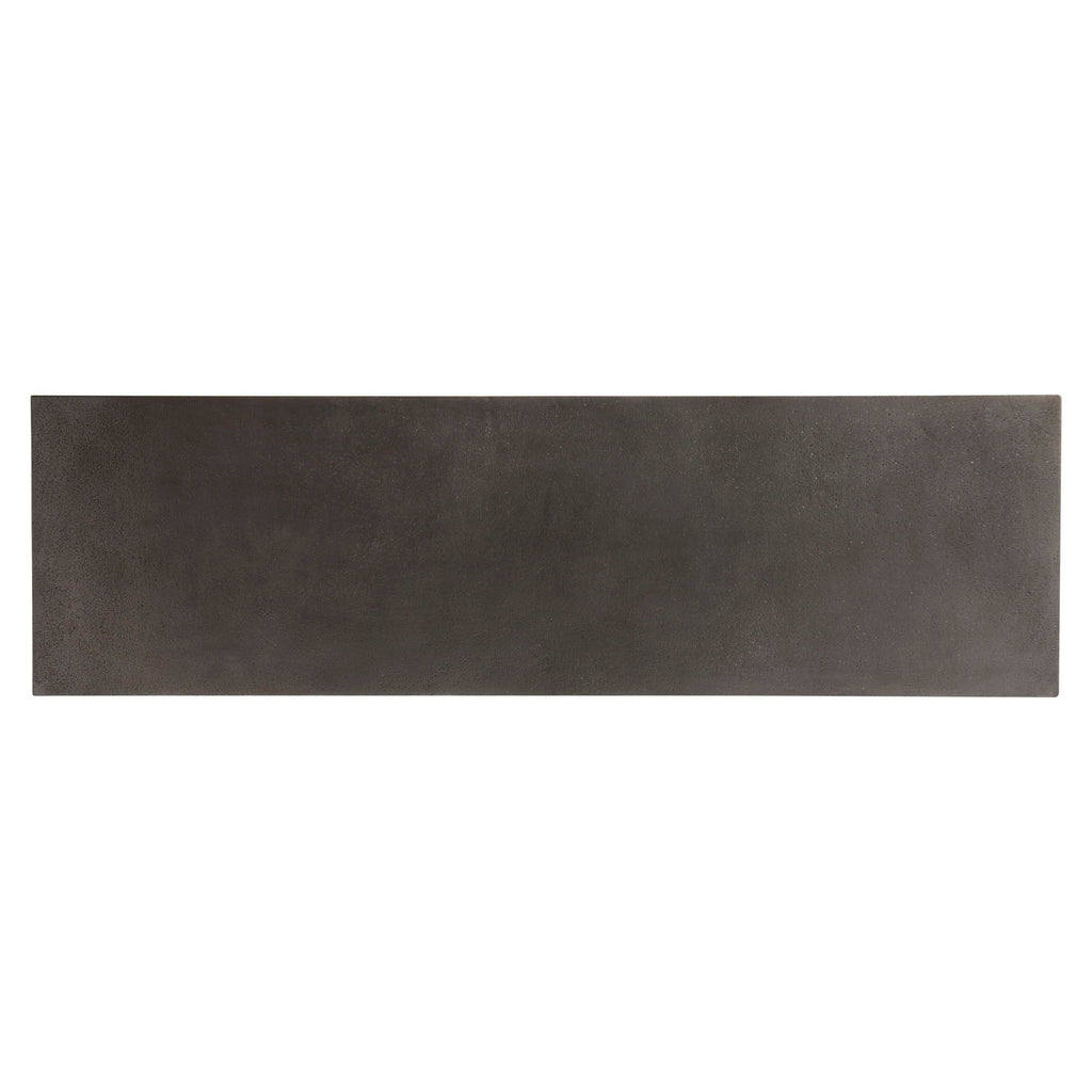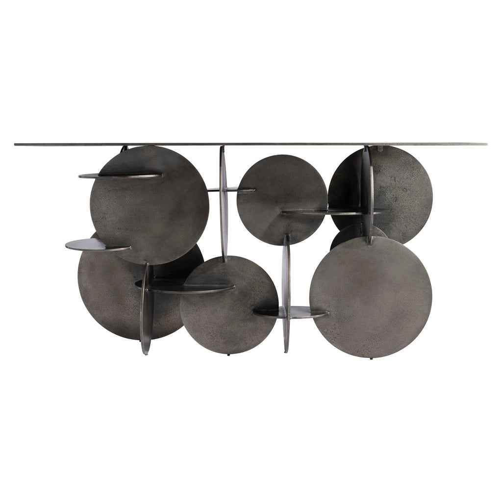 Vertical and horizontal circles of cast aluminum intersect in a dramatic pattern on the Tribus console table. Topped with a rectangular aluminum surface, the table is finished in Graphite.