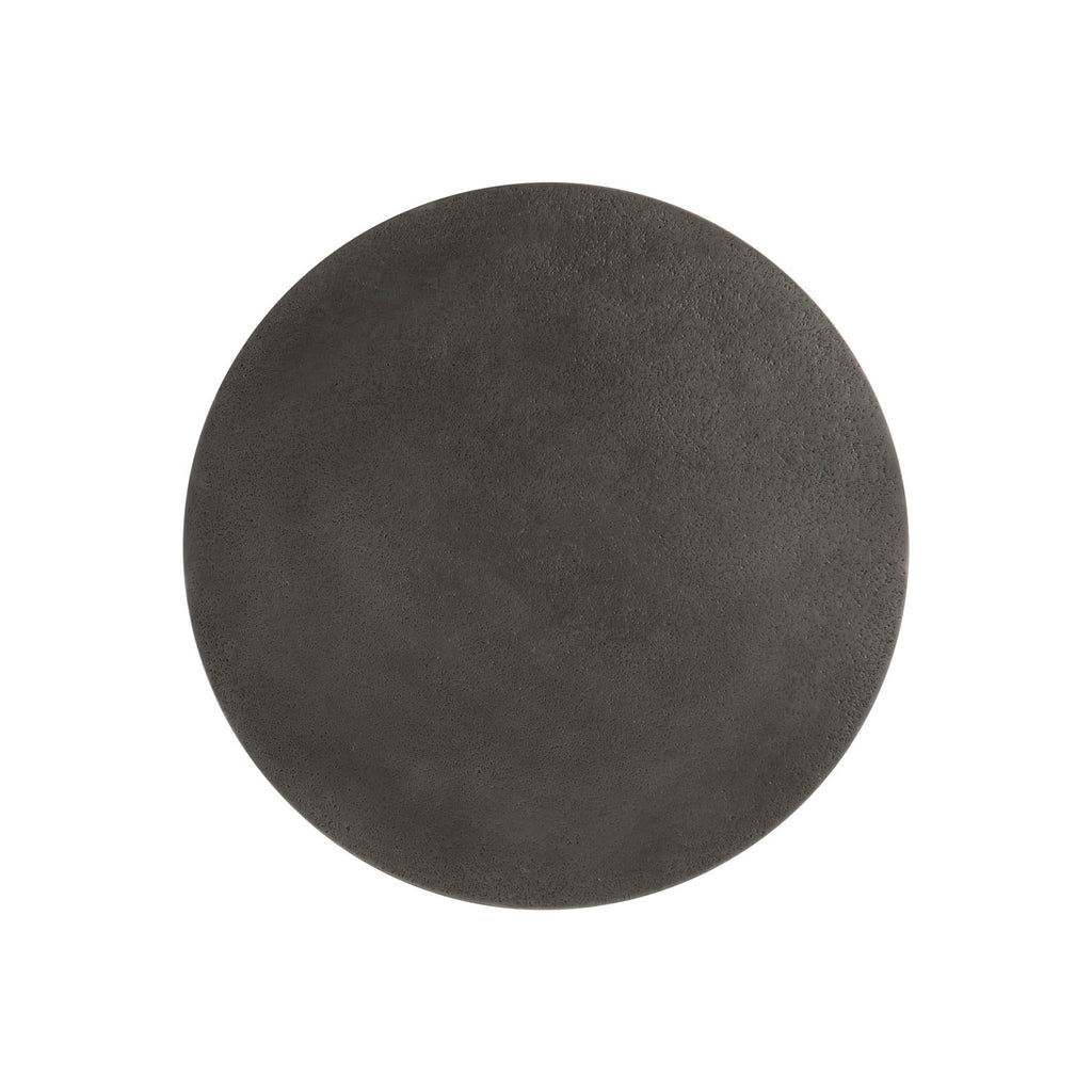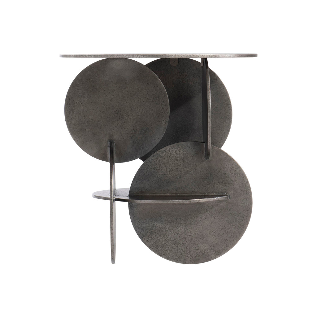 Vertical and horizontal circles of cast aluminum intersect in a dramatic pattern on the Tribus side table. Topped with a round aluminum surface, the table is finished in Graphite.