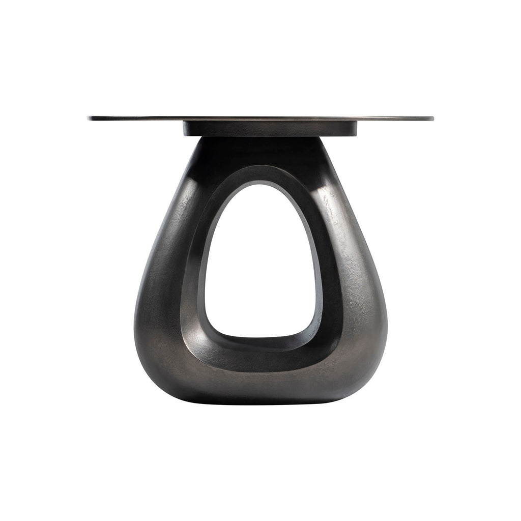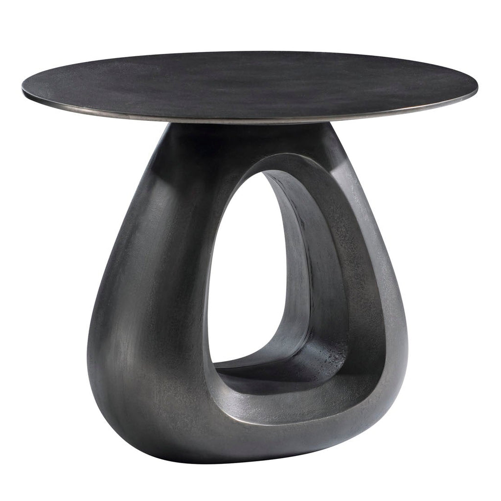 The freeform open base of the Ursa side table is crafted of cast aluminum in Black Nickel finish. It sweeps up to the smooth round top for a beautiful modern organic style.