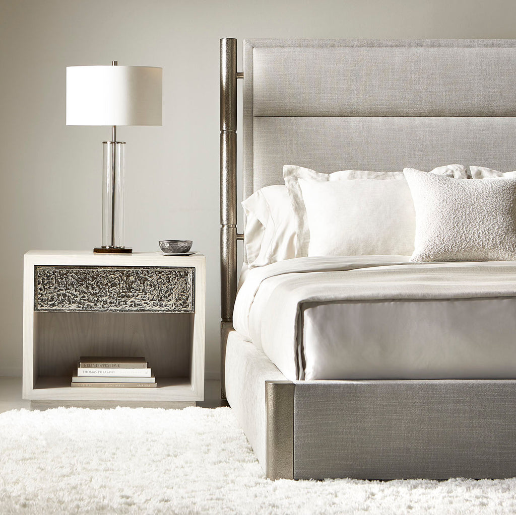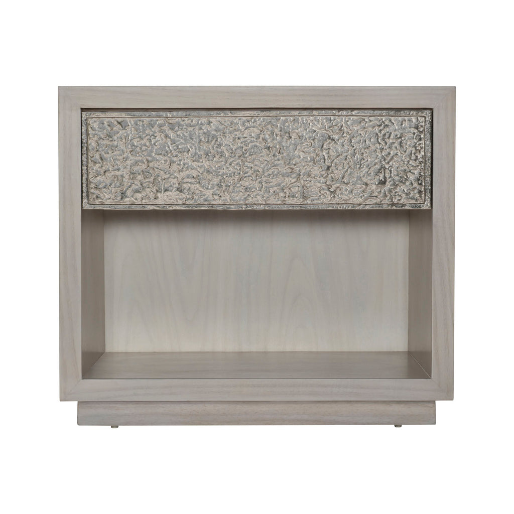 • One drawer with textured cast aluminum drawer front and Bernhardt name plate. One open front compartment below drawer.