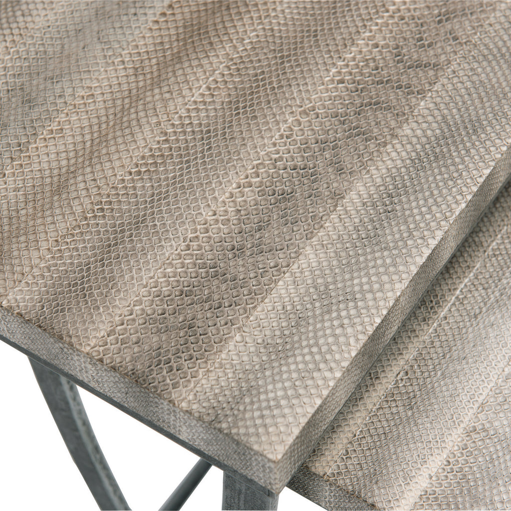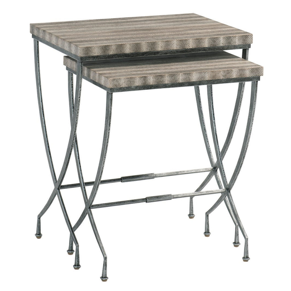 Bernhardt Interiors offers high-design furniture with an eclectic edge. The Wyman nesting tables put a fascinating twist on a traditional staple. The top of each table is wrapped in exotic snakeskin, lending a touch of flair and glamour evocative of jet-set style. This wild, yet subtle material pairs elegantly with an iron base finished in aged pewter.