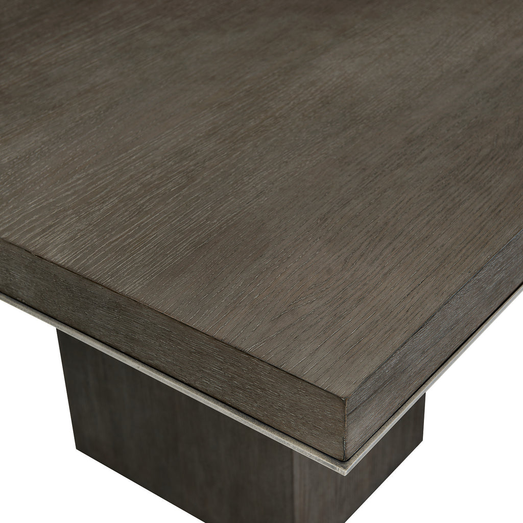 • Rectangular dining table of Ash solids and White Oak veneer with cast aluminum bead trim around apron bottom and double pedestal base.