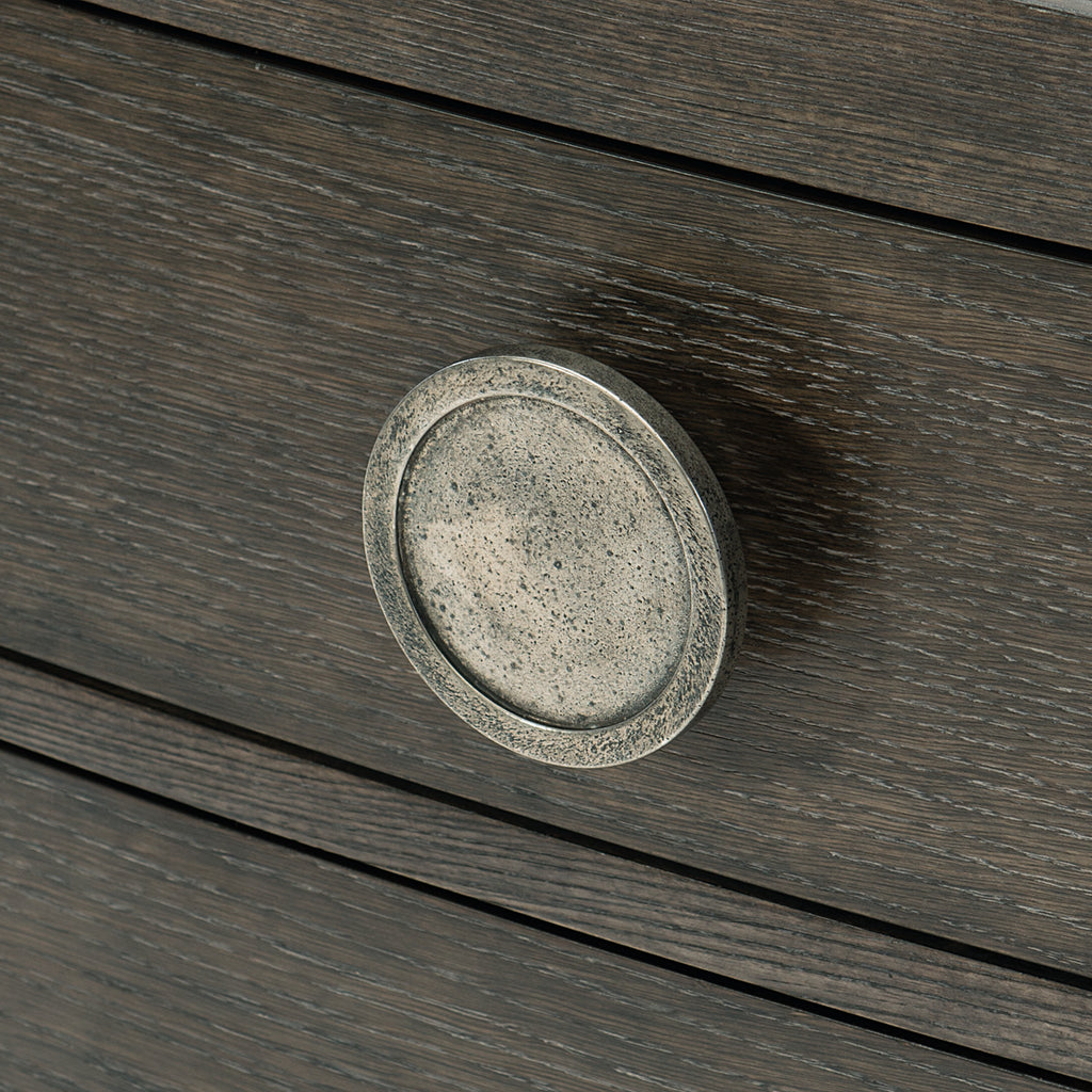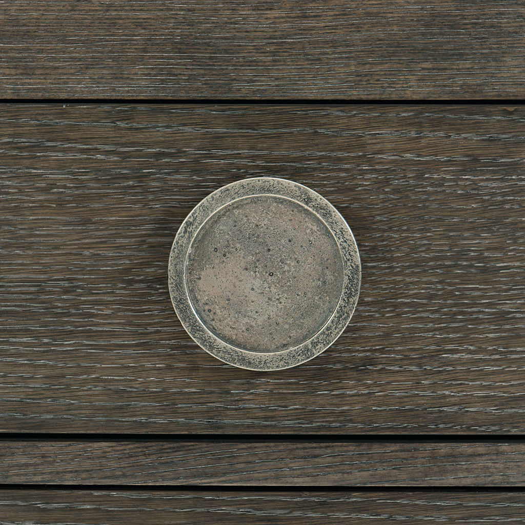 With its flawless artistry and understated elegance, Linea sets a new standard for rustic modern collections. The Linea bowfront bachelor’s chest positions a large drawer between two smaller ones, creating an appealing symmetry. Wire-brushed oak veneers offer subtle textures, while a Cerused Charcoal finish partners elegantly with cast aluminum hardware in a Textured Graphite finish. The heavily textured metal gives the circular pulls a jewelry-like feel, adding to the artistic appeal of this eye-catching piece.