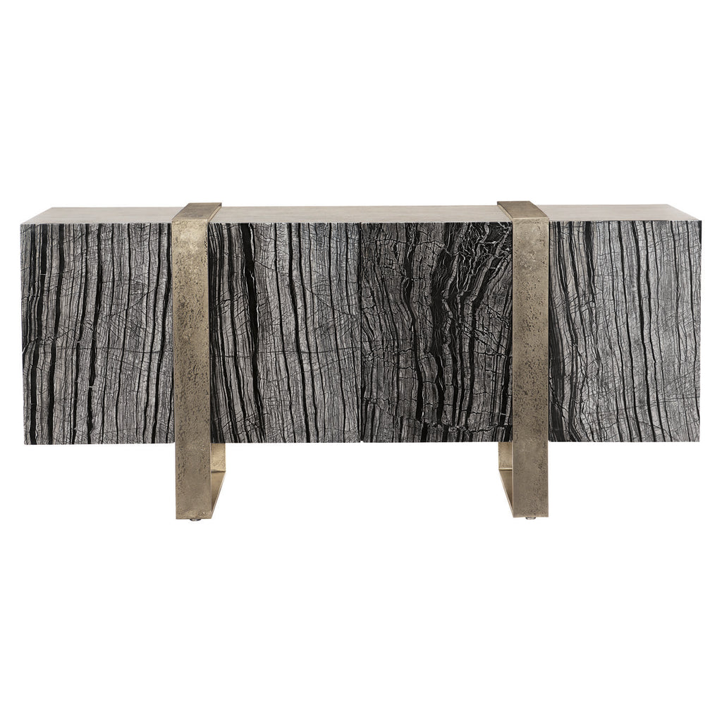 With its flawless artistry and understated elegance, Linea sets a new standard for rustic modern collections. In the stunning Linea entertainment console, boldly patterned Black Forest marble and textured cast aluminum blend seamlessly in splendid style. The striking design features four push-to-open, self-closing doors and a metal frame which wraps around the entire case. With its deep charcoal background and snow-white striations, the marble lends a high-end, dramatic look to this functional piece.