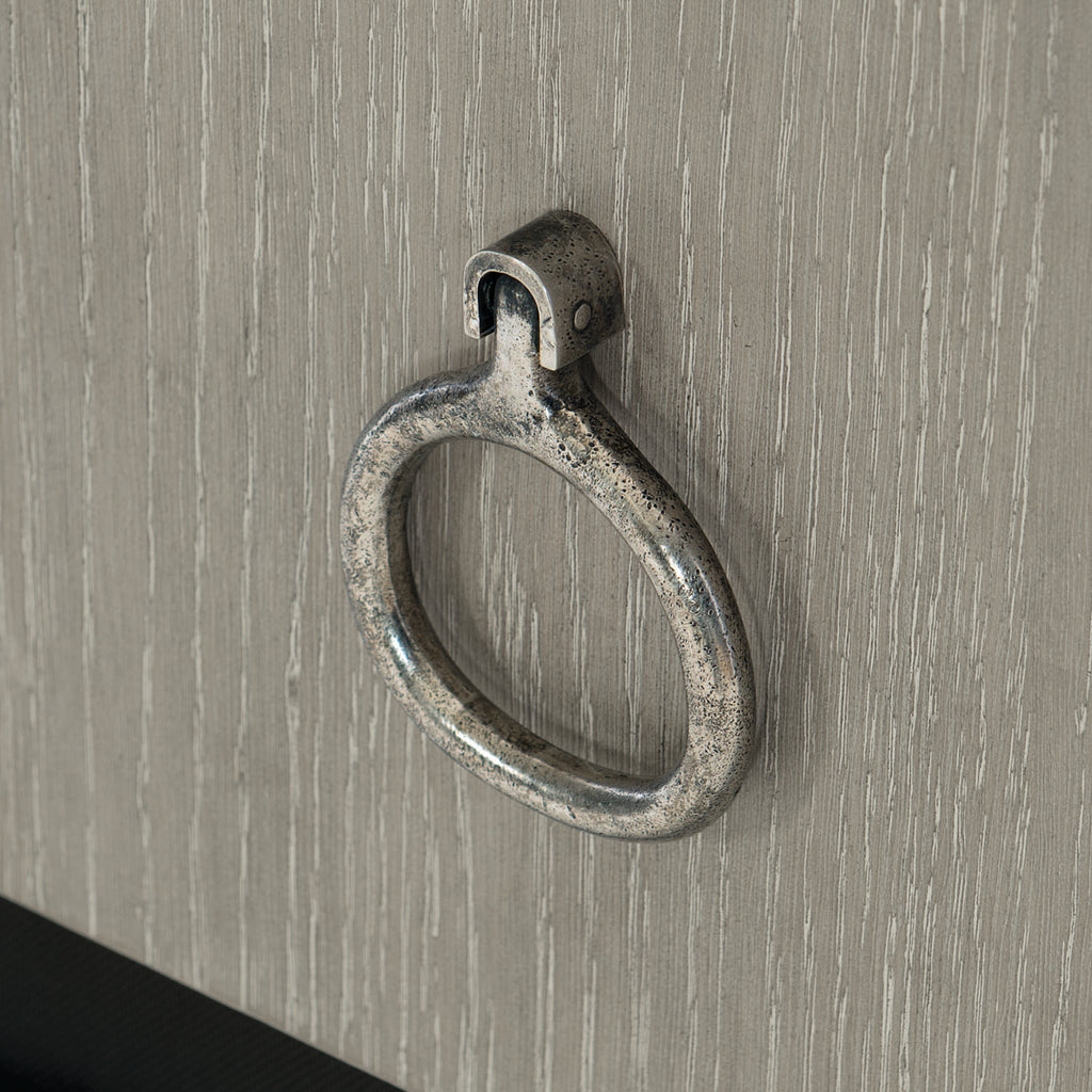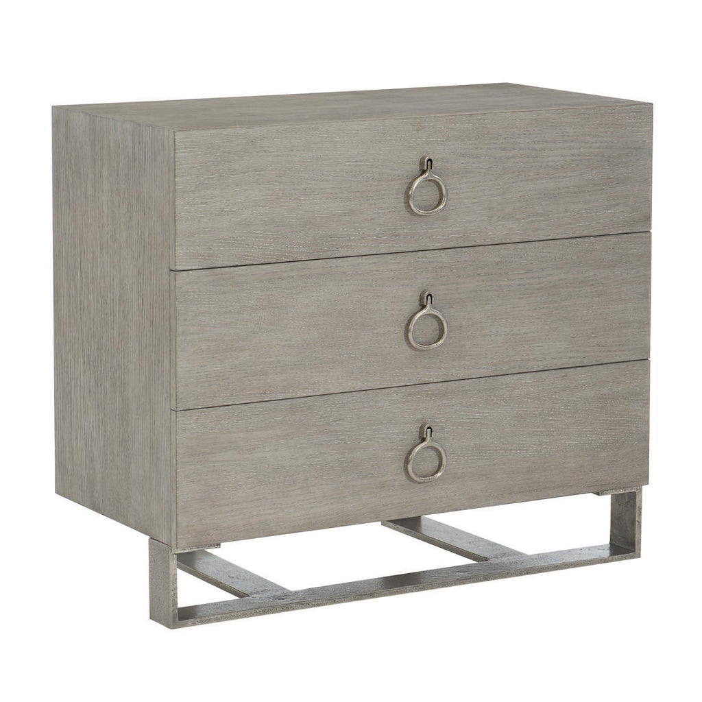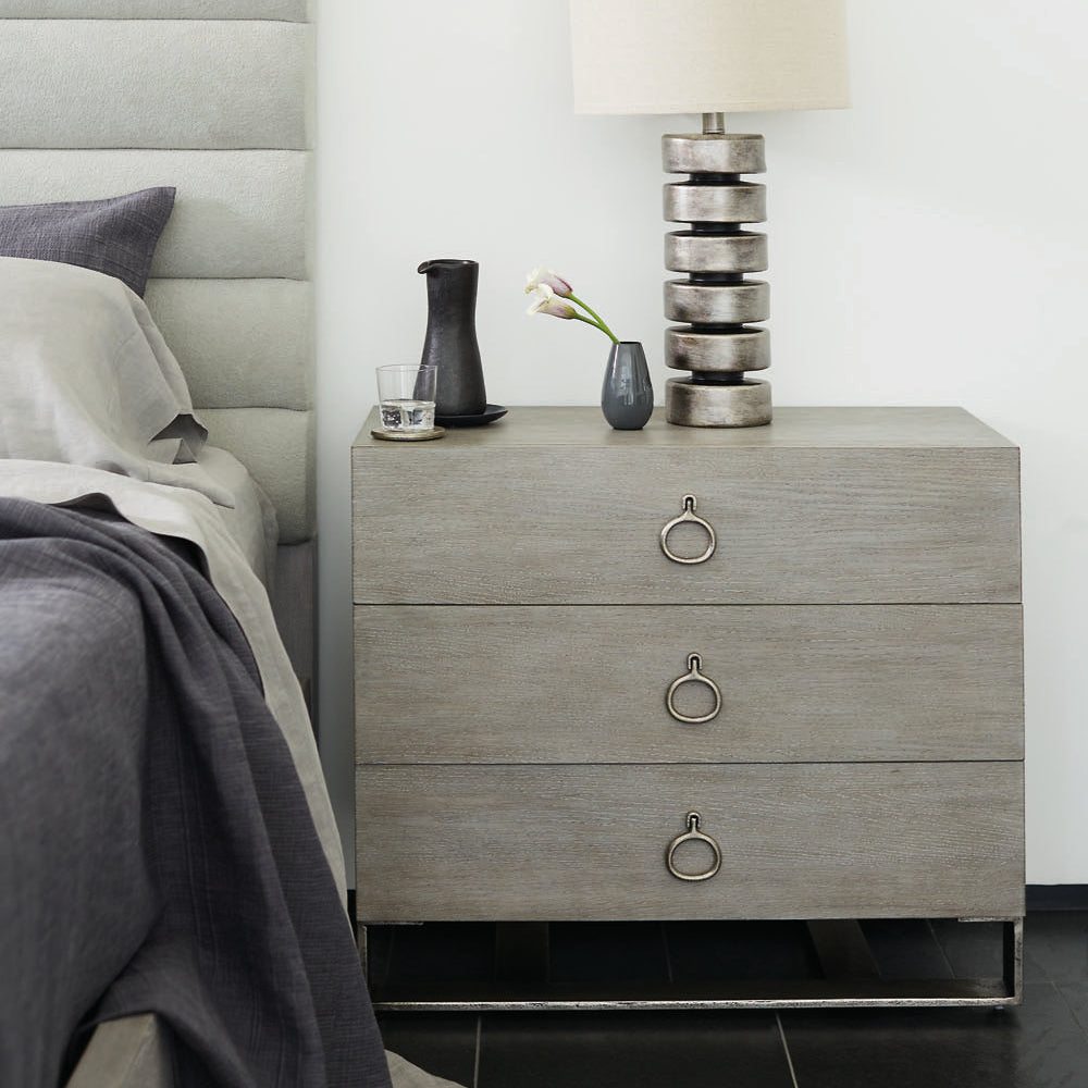 With its flawless artistry and understated elegance, Linea sets a new standard for rustic modern collections. The Linea nightstand features a trio of drawers supported by an open cast aluminum base. Finished in Cerused Greige, wire-brushed oak veneers offer subtle textures. Irregular ring pulls in a Textured Graphite finish deliver a jewelry-like feel, adding to the artistic appeal of this eye-catching piece.