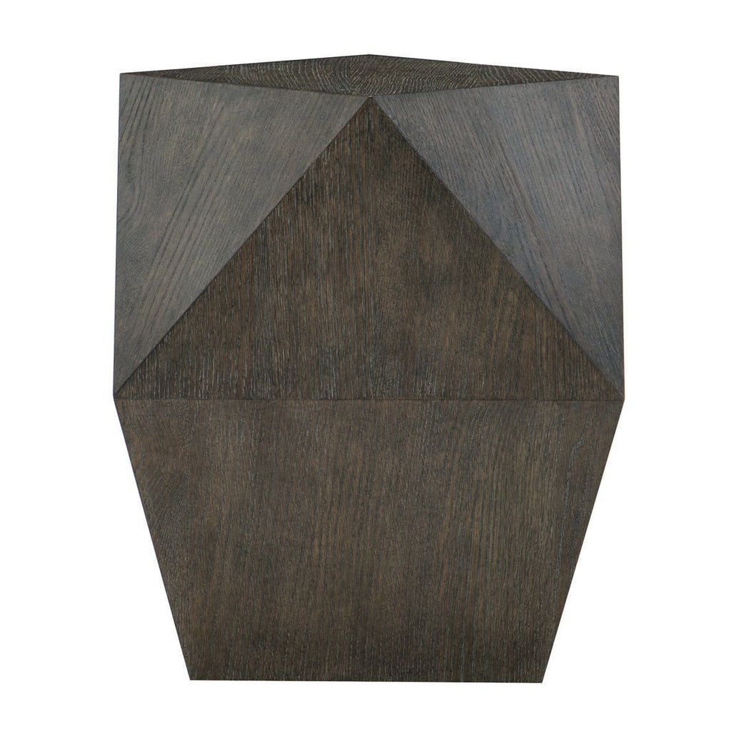 With its flawless artistry and understated elegance, Linea sets a new standard for rustic modern collections. The Linea end table is a study in elegant geometry. Six triangular planes with chamfered corners on the upper portion join a base of four trapezoidal planes. Wire-brushed oak veneers offer subtle textures in a Cerused Charcoal finish. The end result is a visually unique piece with a sophisticated yet relaxed style.