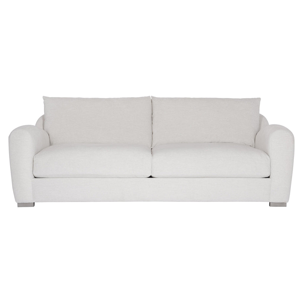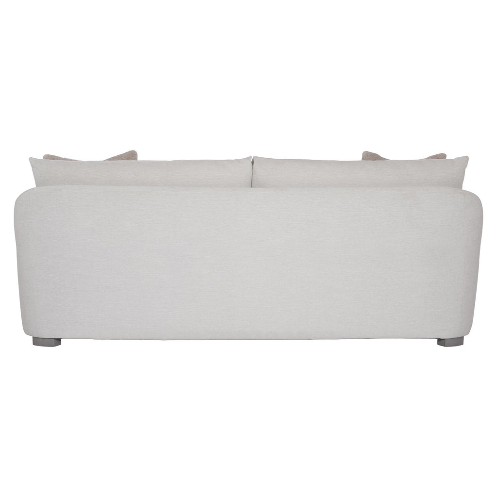 The Bernhardt Living Asher sofa has a unique frame with high-loft curved arms and a shaped back. Comfort comes from fiber back pillows, as well as four Blendown throw pillows. The enticing shape and deep seat creates a luxuriously restful statement.