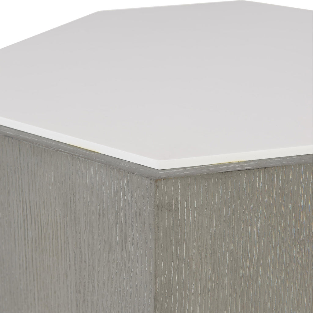 Inspired by mid-century modern design, the Bernhardt Living Avenue accent table presents a clean geometric form with minimal ornamentation. A gray truffle finish on the quartered oak veneers is aesthetically calming while maintaining a high level of sophistication. A maple veneer top in lacquered white finish provides contrast. Simple and sleek, this octagonal table is a steadfast companion in the luxe living space.