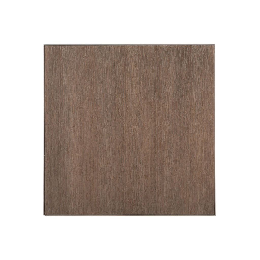 Revealing mid-century influences, the Bernhardt Living Belvedere end table combines metal and wood in a clean, asymmetrical design. Quartered oak veneers in portobello finish bring a warm tone, while a steel frame finished in antique pewter contributes a sophisticated cool. A modern industrial look for the luxe living space.