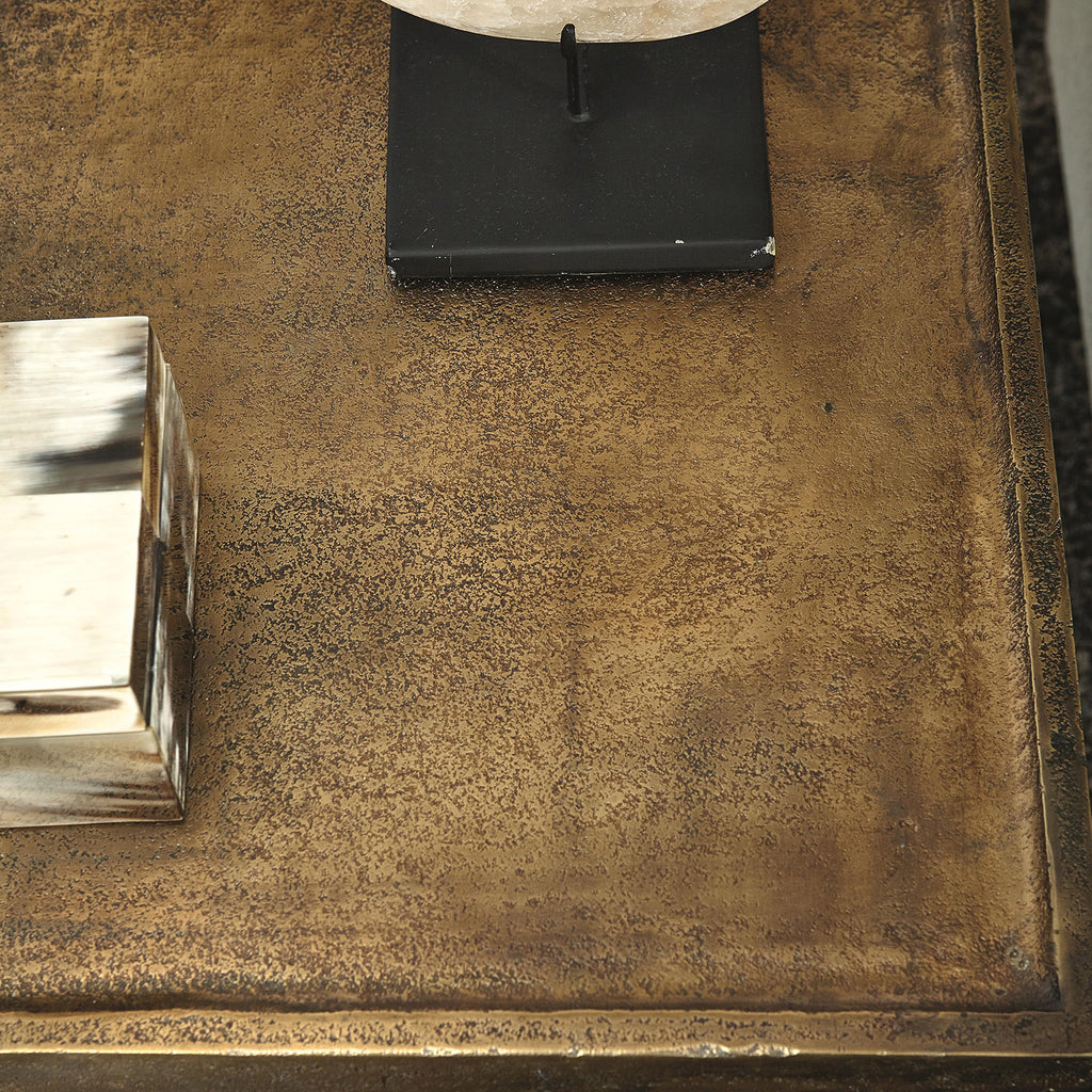 Crafted from cast aluminum, the Bernhardt Living Benson end table features a vintage brass finish that offers warmth, texture and a hint of glamour. A gallery top and slender tapered legs form a sleek, minimalist design, but the vibe is antique and luxurious. With its subtle elegance, this accent table serves as a handsome companion to sofas and chairs.