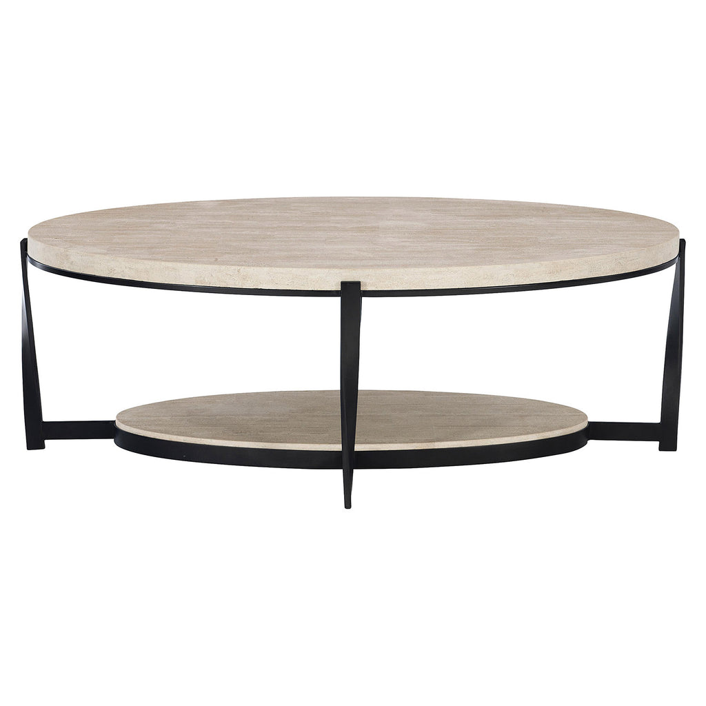 Bernhardt Occasional offers a range of upscale designs for luxe living spaces. The Berkshire cocktail table pairs elegant stone surfaces with textured steel. Finished in aged pewter, the dark metal base contrasts with the organic, neutral hues of the stone top and shelf. Twisted steel legs add movement and visual interest.