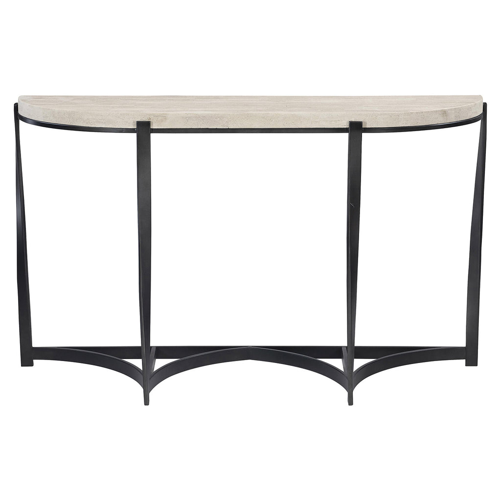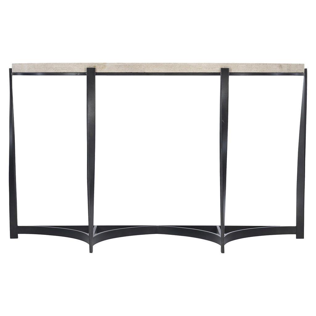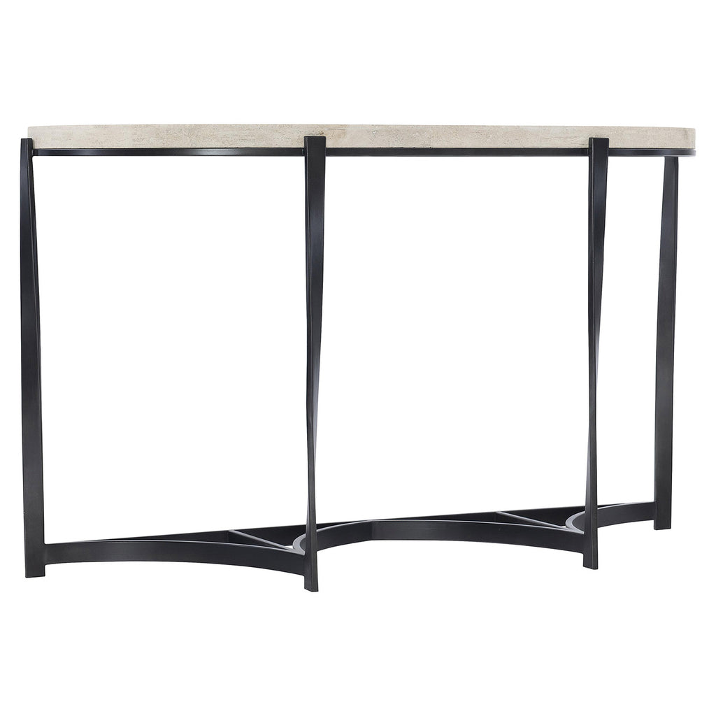 Bernhardt Occasional offers a range of upscale designs for luxe living spaces. The Berkshire cocktail table pairs elegant stone surfaces with textured steel. Finished in aged pewter, the dark metal base contrasts with the organic, neutral hues of the stone top and shelf. Twisted steel legs add movement and visual interest.