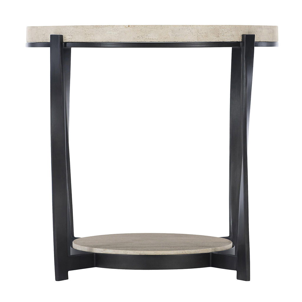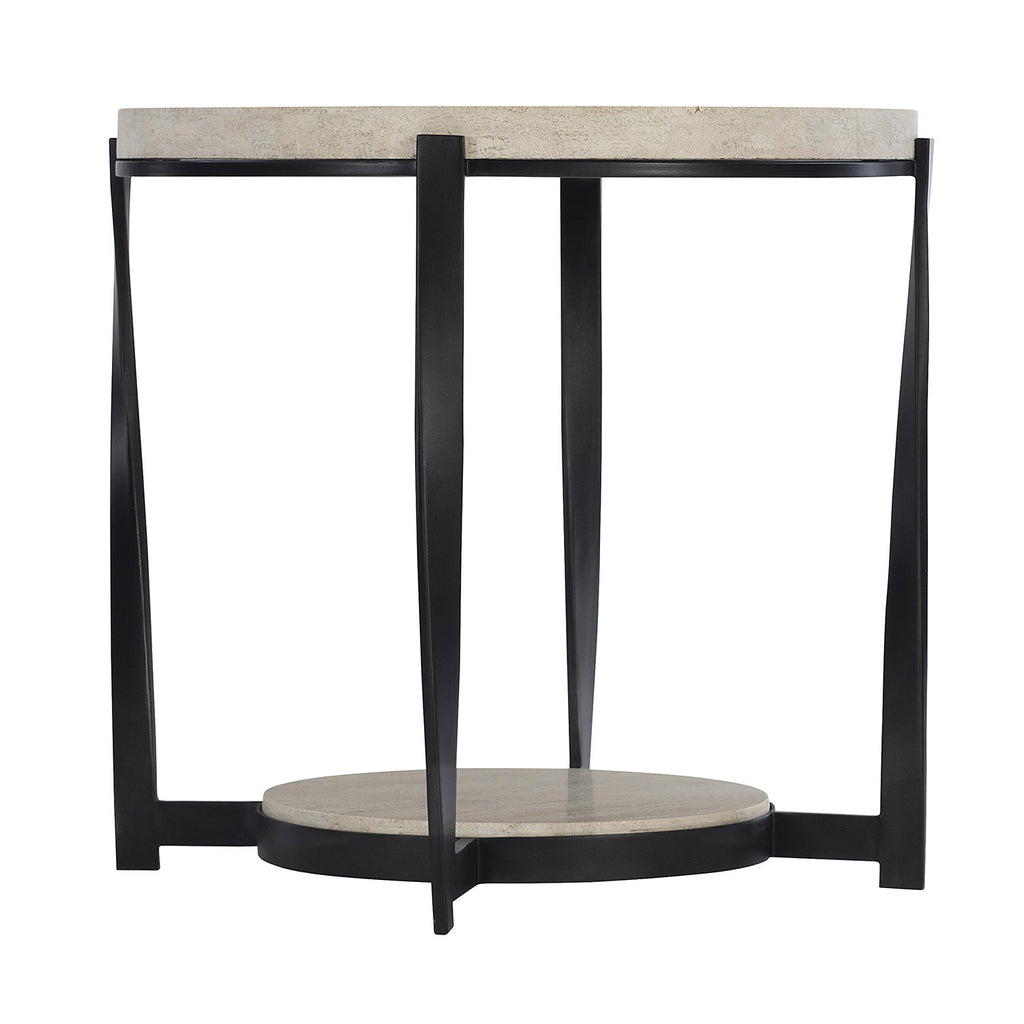 Bernhardt Occasional offers a range of upscale designs for luxe living spaces. The Berkshire side table pairs elegant stone surfaces with textured steel. Finished in aged pewter, the dark metal base contrasts with the organic, neutral hues of the stone top and shelf. Twisted steel legs add movement and visual interest.