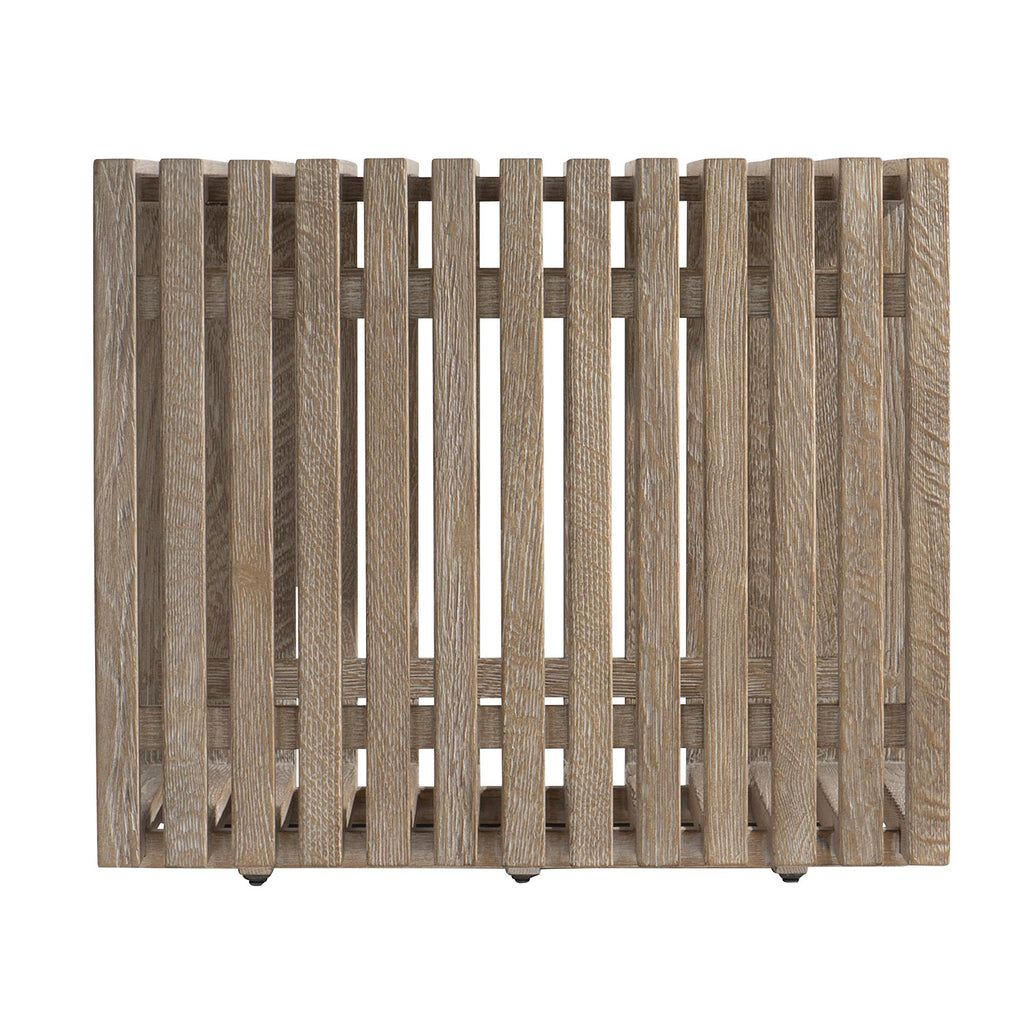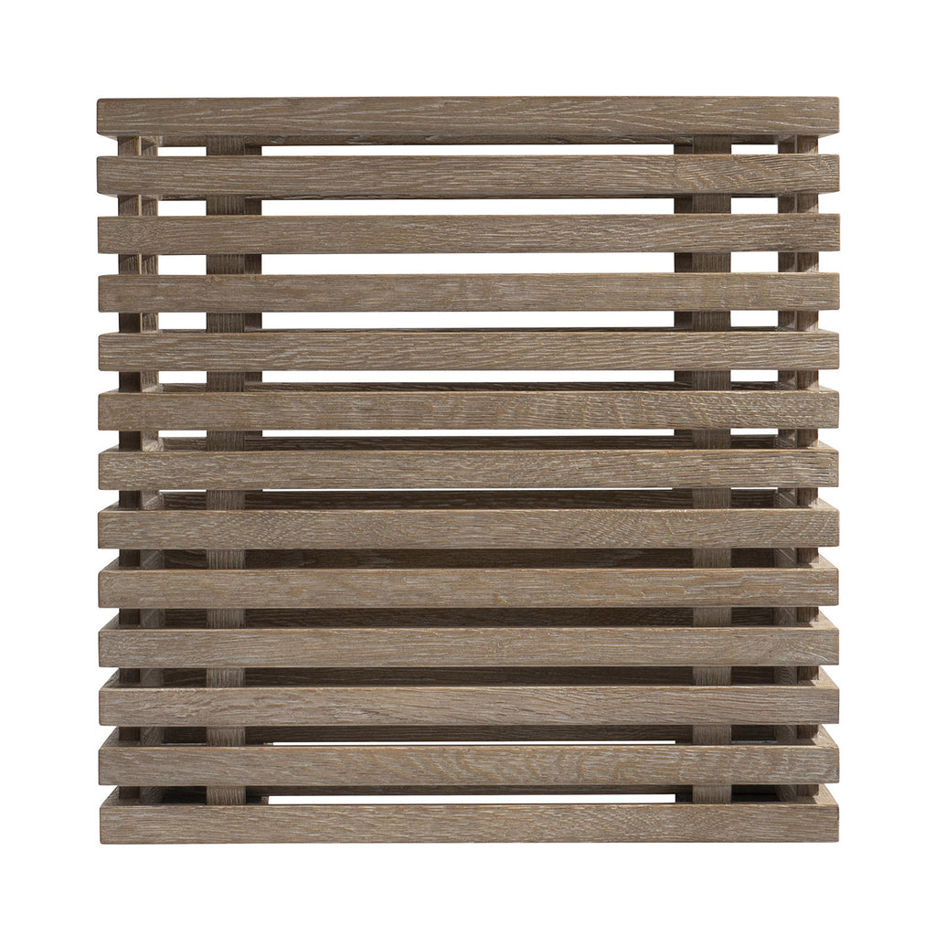 Taking a casual approach, the Bernhardt Living Brumley side table redefines a simple cube. Laid-back style is created with a slatted wood top, sides and shelf in Marcona finish. The painted metal base, in Anthracite finish, features slim, squared legs.