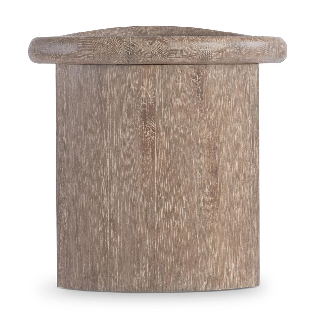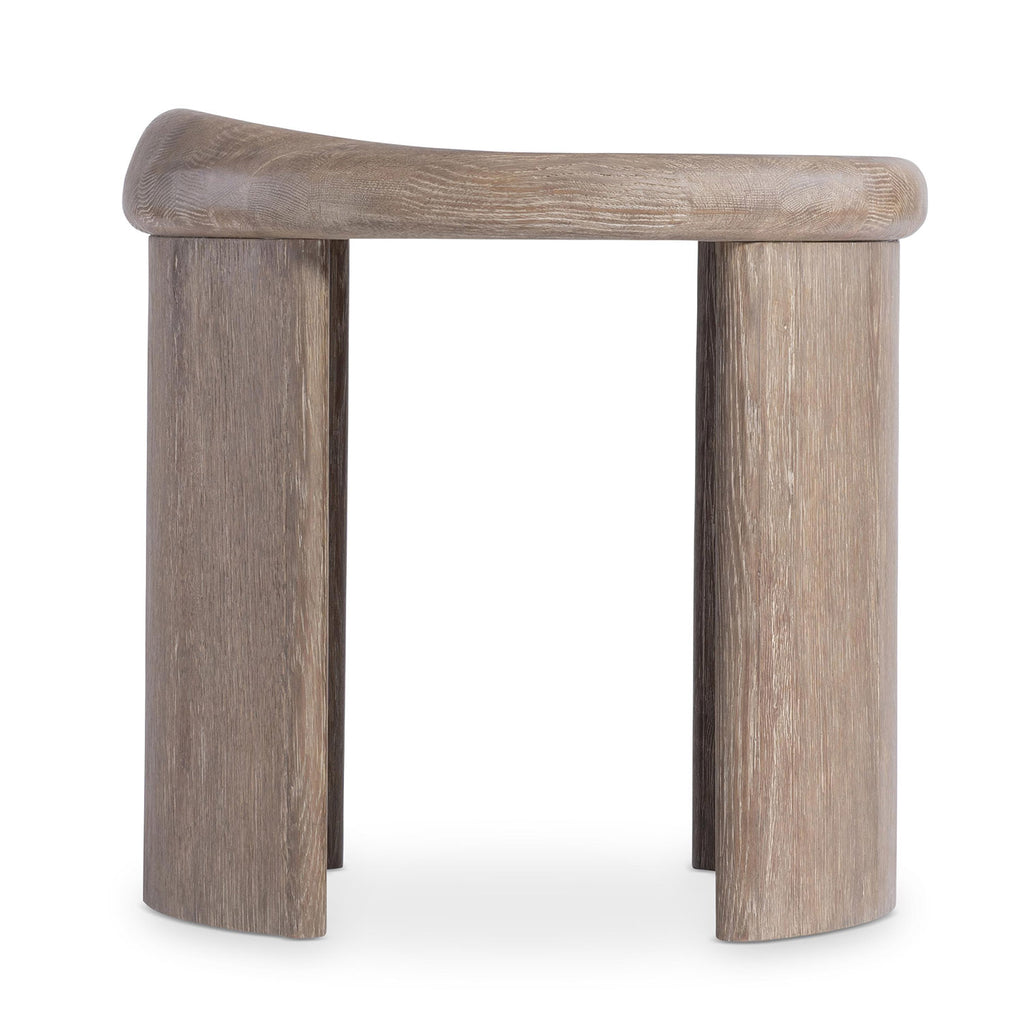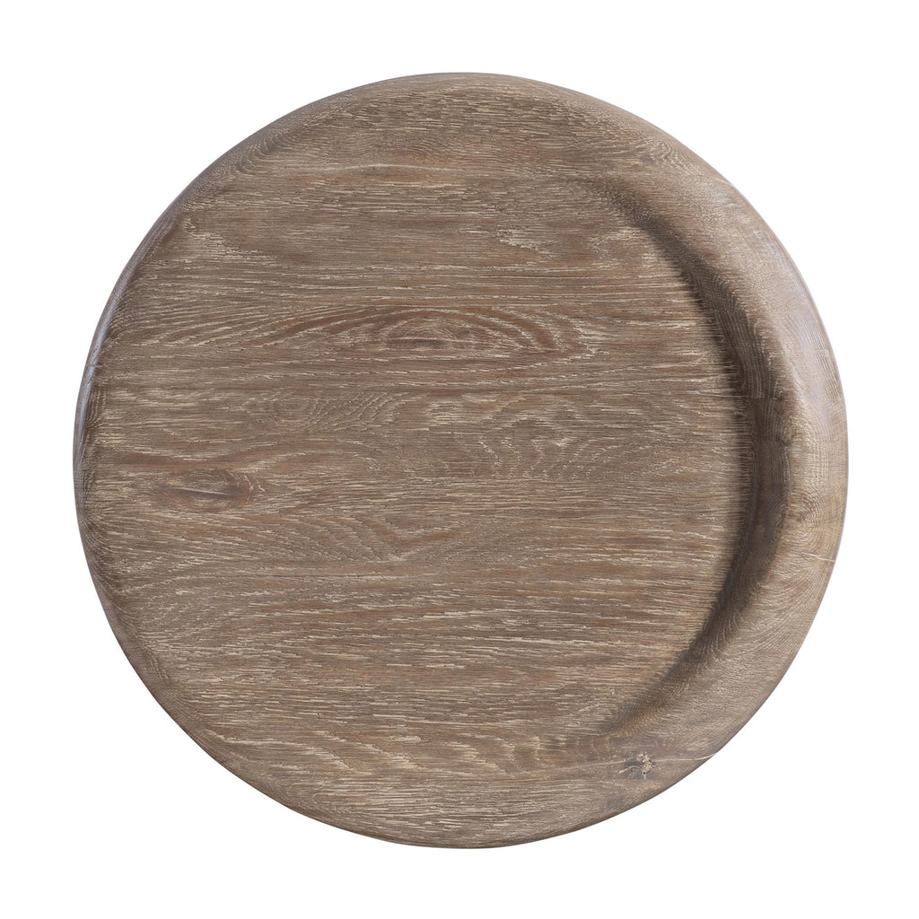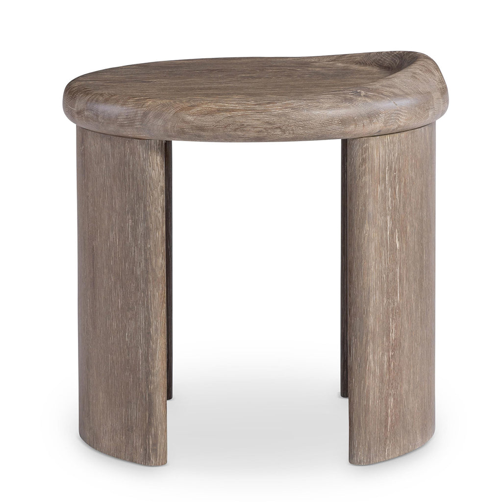 Cast resin takes on organic shape for the modern Bernhardt Living Bryant side table. A round top has a raised edge on one sides, resting on two curved supports. The design showcases a textured wood grain in the Aurum finish.
