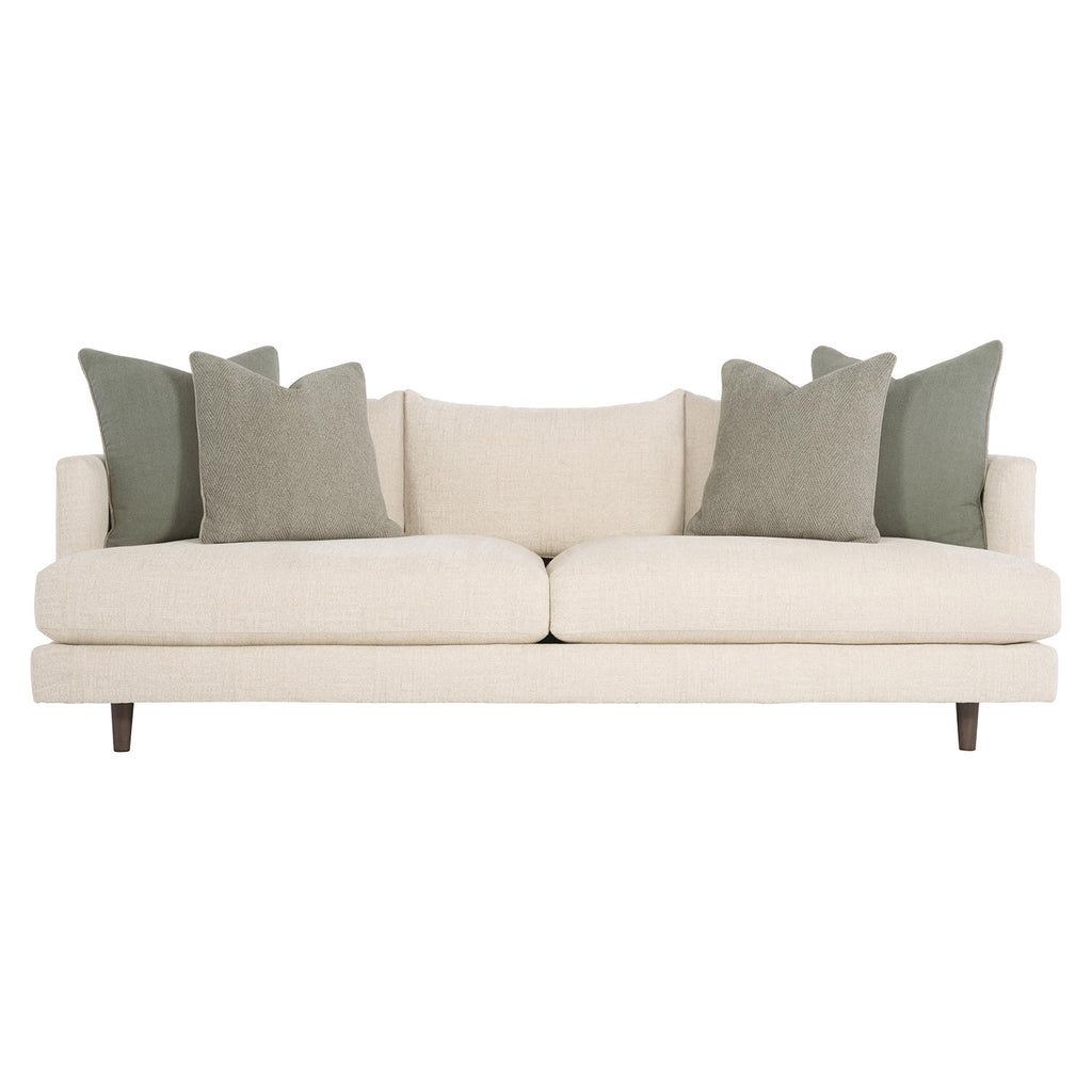 The Bernhardt Living Colette sofa delivers clean, modern style and high-end comfort. Track arms form a tuxedo silhouette reminiscent of the Art Deco era, while horizontal lines create the stability and length found in contemporary forms. Designed with gracious scale and deep, luxurious seating, it features feather down cushions and three loose fiber back pillows. Tasteful and exquisitely crafted, this sofa elevates the style of any interior.