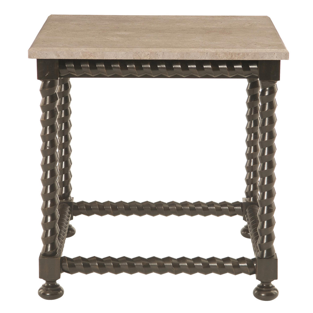 Impeccably crafted, the Bernhardt Living Cordova end table is a unique piece that brings a chic, polished look to an interior. A modern update on a style popular in the early Baroque period, the spiral wood base creates visual interest and a sense of movement. A rich ebonized finish provides a contrast to the travertine, further enhancing the appeal of this eye-catching design.