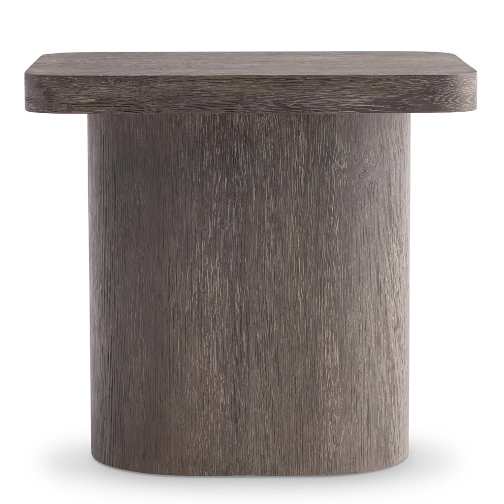 A classic pedestal table showcases a sleek form on the Bernhardt Living Dama side table. The modern organic look is highlighted with a simple column base that supports a square top with softened corners. The woodgrain is highlighted with the wirebrushed Brun finish.