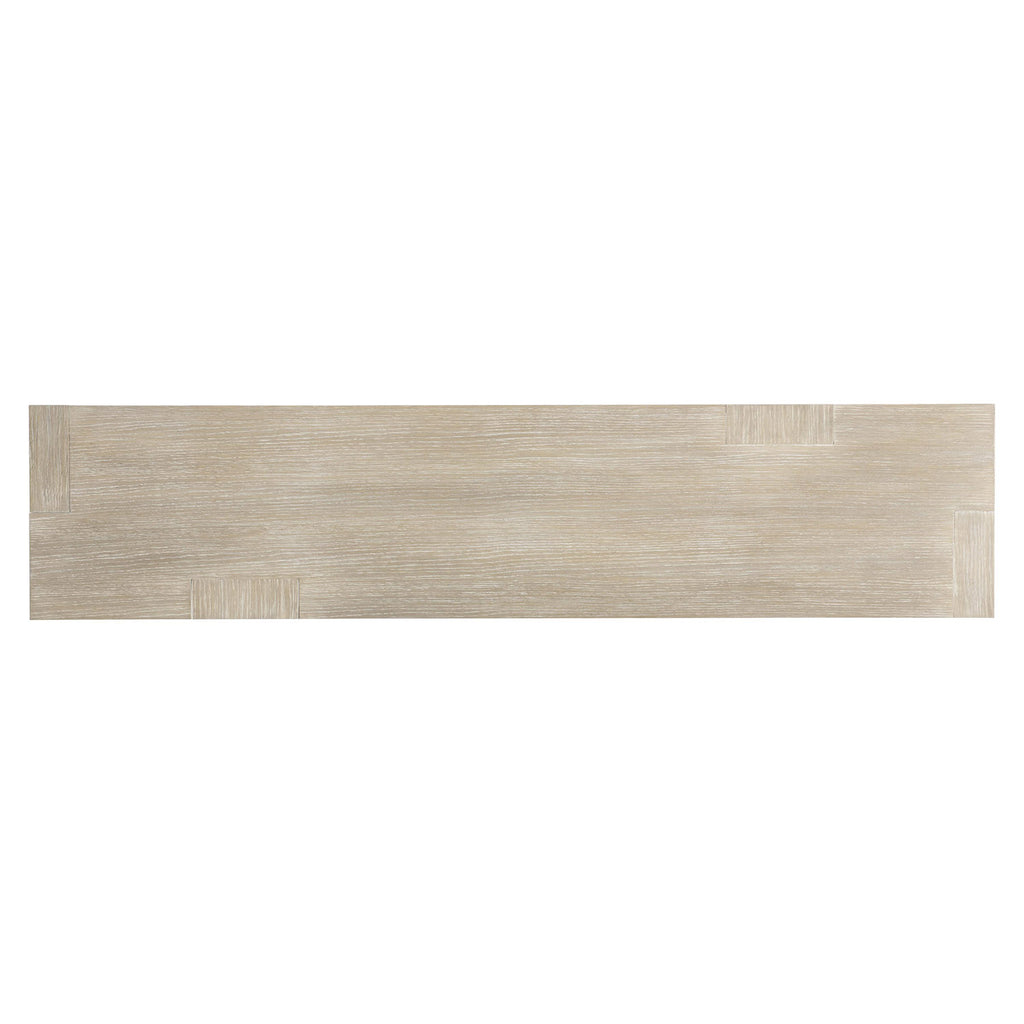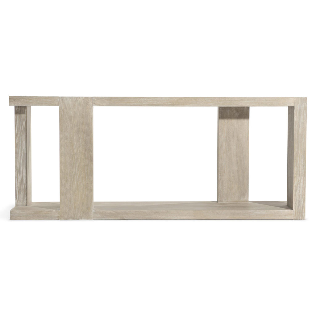 The Bernhardt Living Darsa console table finds a stylish definition in sleek lines and bold shapes. Two side panels are formed with wider profiles, balanced by a thinner panel on the front and one on the back for a unique asymmetrical design. Wire-brushed oak offers texture.