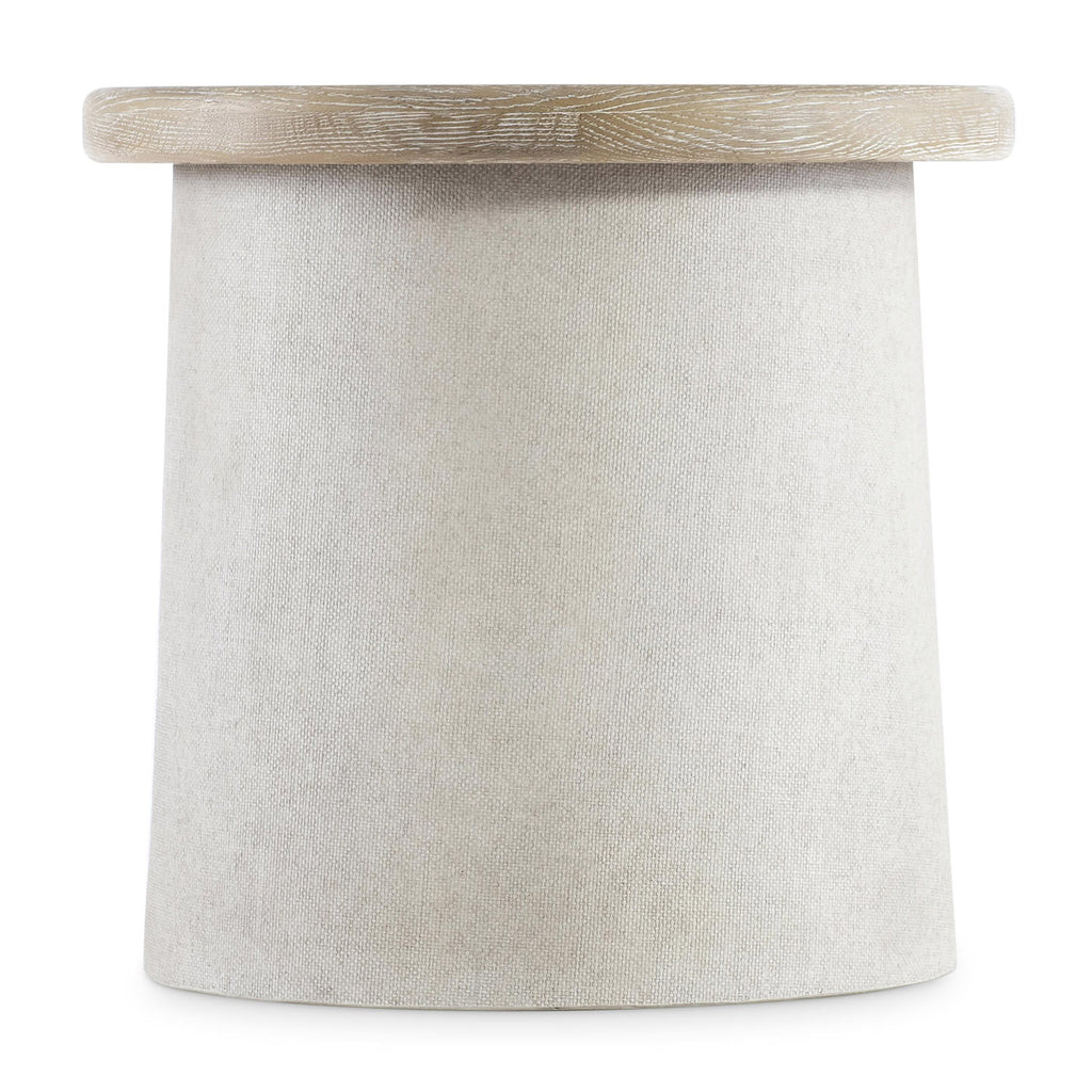 The Bernhardt Living Easley side table has bold totemic design with a wooden top over a resin column base. Texture is at the center of this table's look with a deep wood grain finished in Trevin on the top, and a woven pattern on the base finished in Silt.