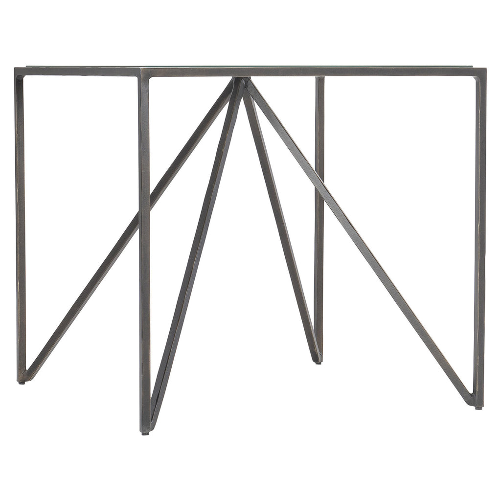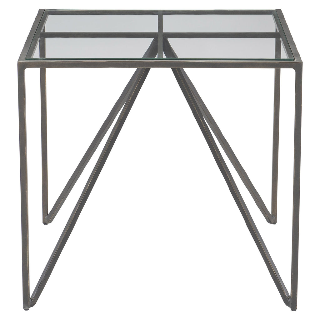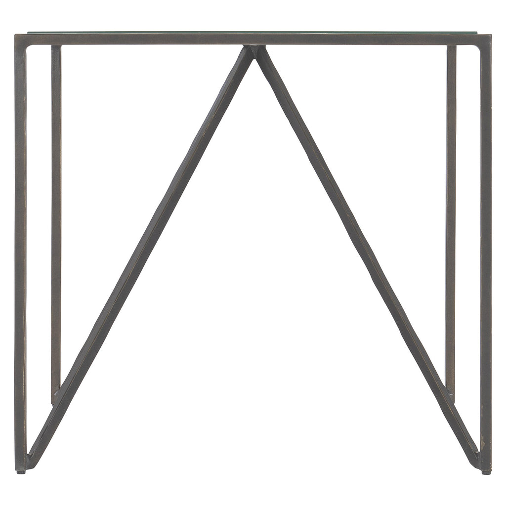 Arches of lightly hammered iron in an aged bronze finish create an airy but structural base for the Bernhardt Living Fulton Side Table. Inspired by architectural designs, the table supports an inset tempered glass top. The look is modern but with a subtly industrial touch.