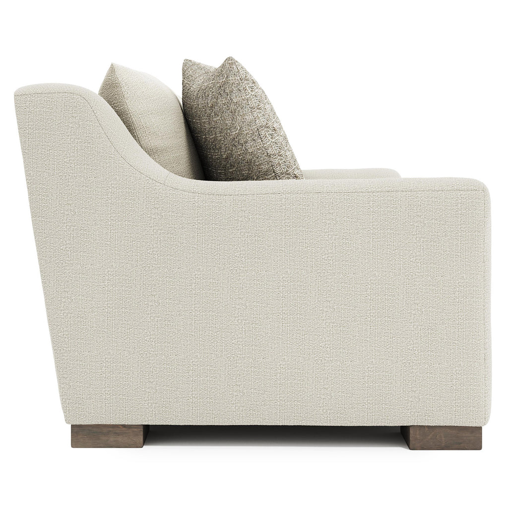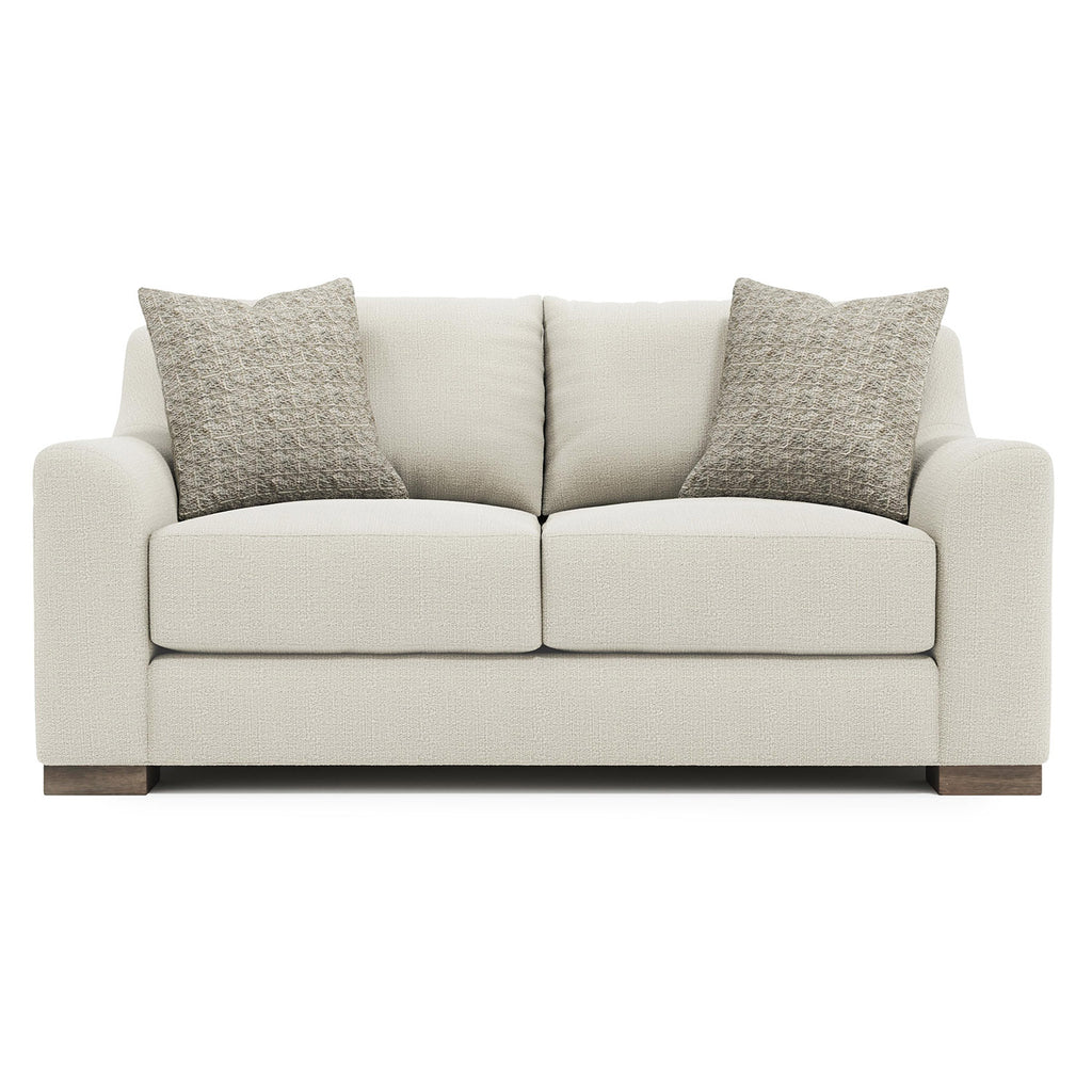 The Bernhardt Living Gabi fabric loveseat offers an alluring comfort destination with sweeping lush curves. The oversized arms frame a deep seat and knife-edge back pillows. Exposed wood block feet support the bold design.