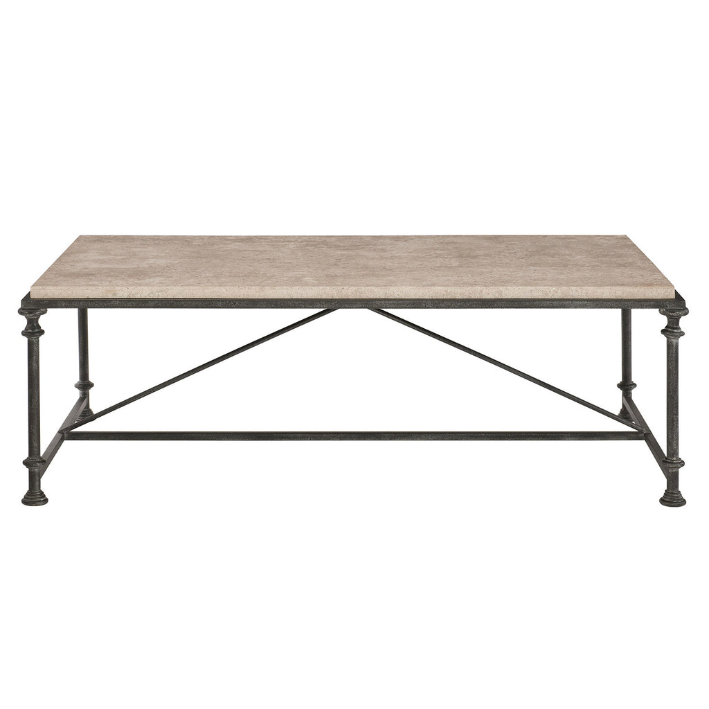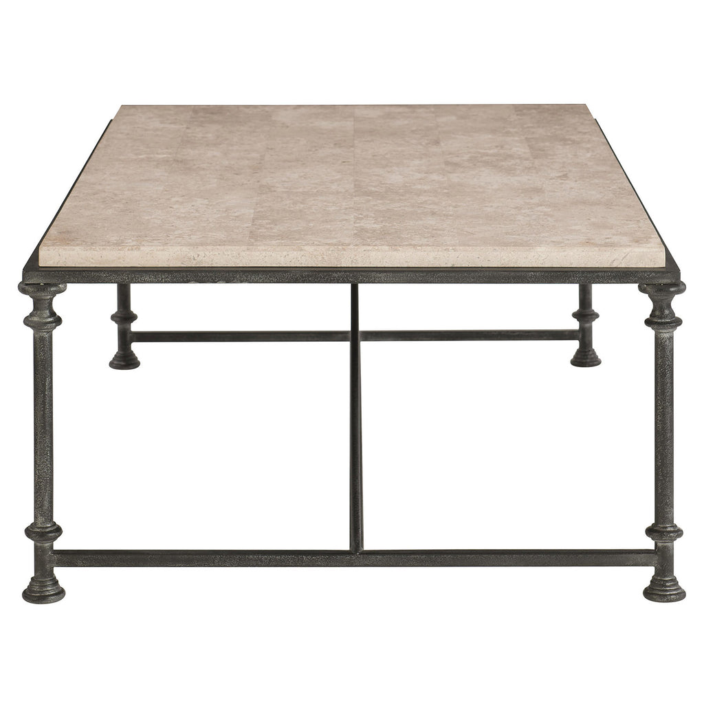A timeless classic, the Bernhardt Living Galesbury cocktail table blends a unique mix of materials in its architectural design. Crafted from solid and tubular steel in an antique silver finish, the sleek base features slender, shapely legs reminiscent of columns. The stretchers form a triangle that leads the eye to a rectangular travertine stone top. The smooth, cream-colored stone lends natural beauty and luxurious allure.
