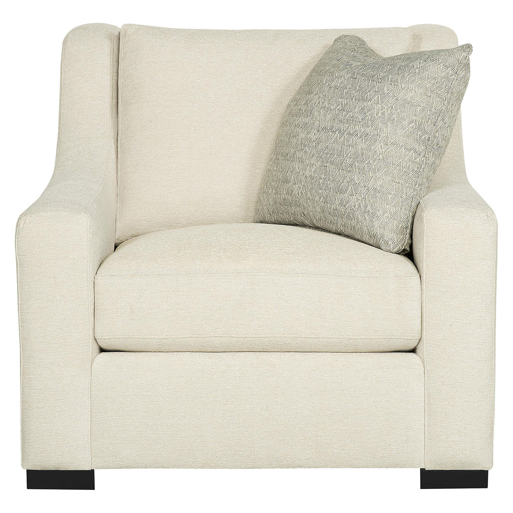 Softly sloped arms blend with a thickly cushioned seat and back to create a clean, transitional design. This chair from the Bernhardt Living Germain furniture series works beautifully with other pieces in the collection as well as with most furniture styles. Use it with a matching ottoman or alongside a sofa or loveseat to bring more comfort to a room. Wide wood legs support the sturdy frame, ensuring a comfortable place to lounge.