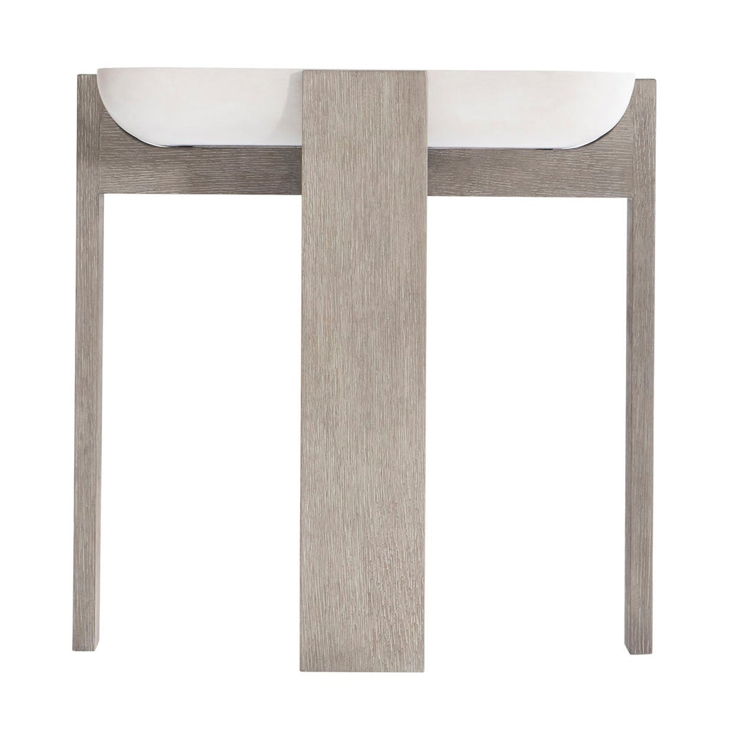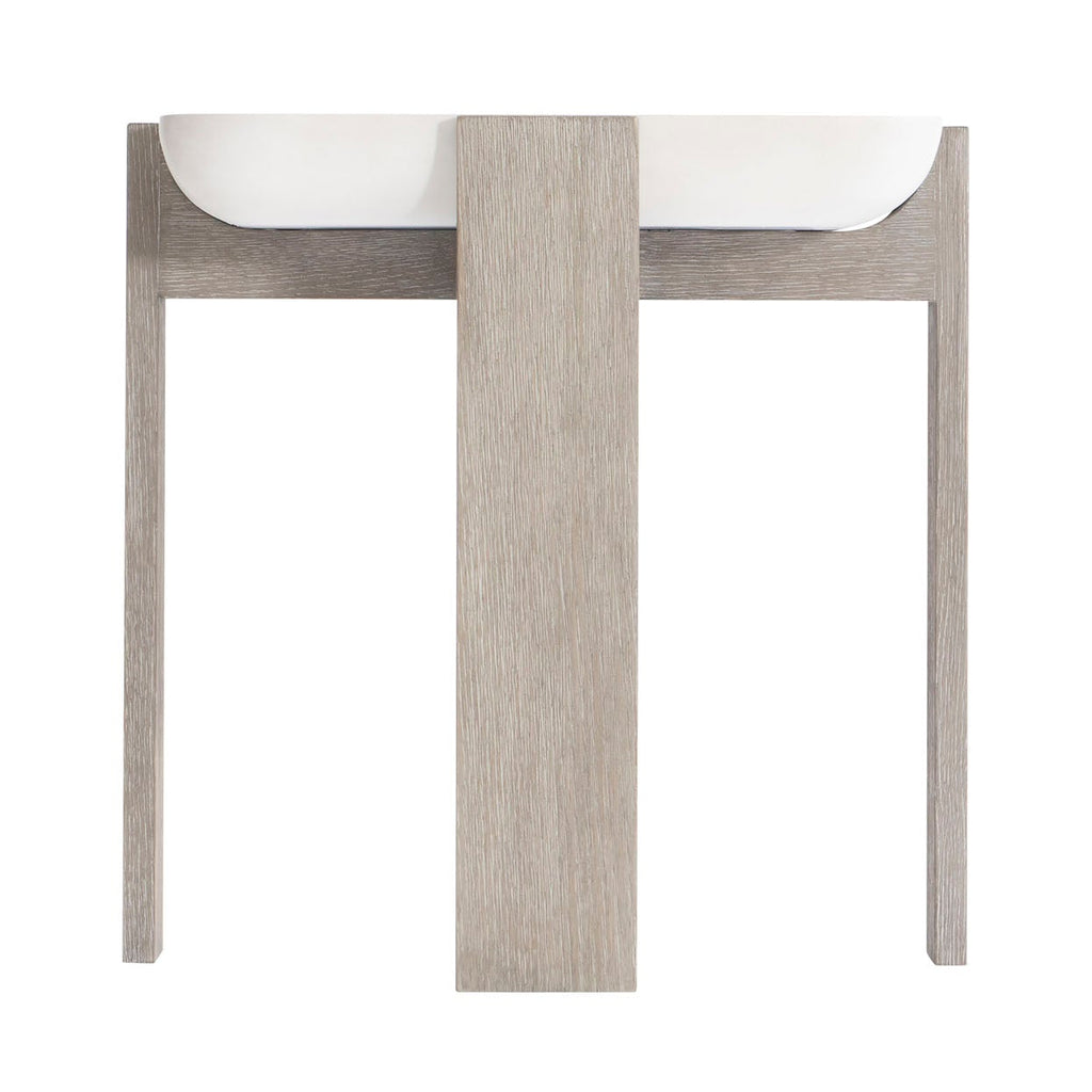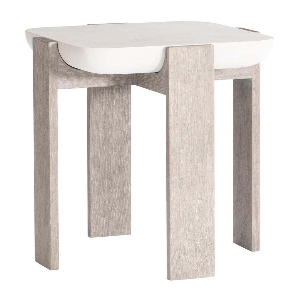 A faux concrete top in a Sand Grey finish is cradled in a wood frame for the Gooding side table. The basin shaped top is supported by wooden legs that flow to the top. The exposed wood is finished in Flint for a modern organic style.