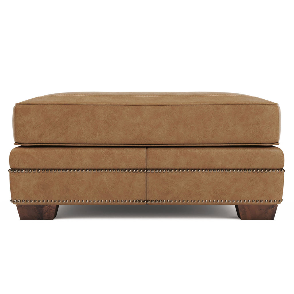 Large and luxurious, the Grandview leather ottoman adds stylish comfort to any space. The cushion is tightly upholstered in fine leather and finished with decorative stitching. Nailhead trim adds a refined accent, while tapered block feet contribute modern flair.