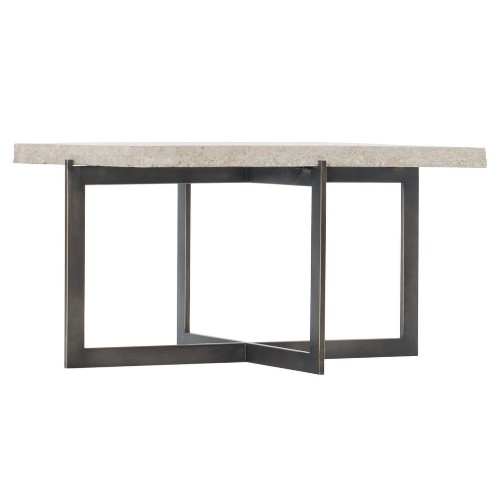 Bernhardt Occasional offers upscale designs for luxe living spaces. Appealing from every angle, the Hathaway cocktail table features clean lines and a distinctly modern style. With origins in mid-century design, the cross-shaped steel base provides structural stability and linear appeal. An oil-rubbed bronze finish on the base creates an engaging contrast with the white travertine stone top. Whether standing alone or bunched with others, this piece effortlessly holds its own in the center of a room.