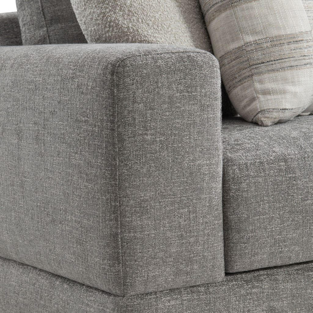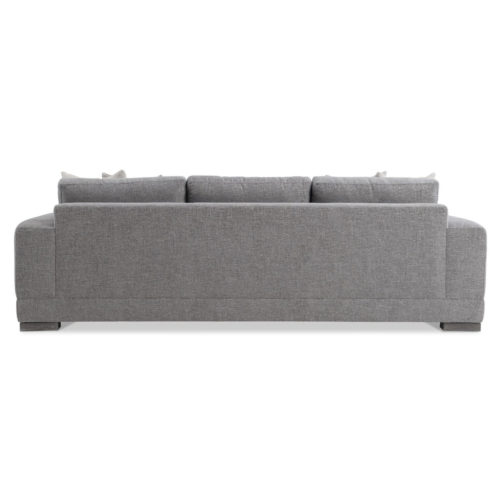 Straight lines are softened with gentle curves on the Lars sofa, complementing the wide track arms and bold silhouette. Plushly deep seat cushions and box-edge weltless bordered back pillows craft a comfort destination. Four wide block feet take a stance in textured wood.