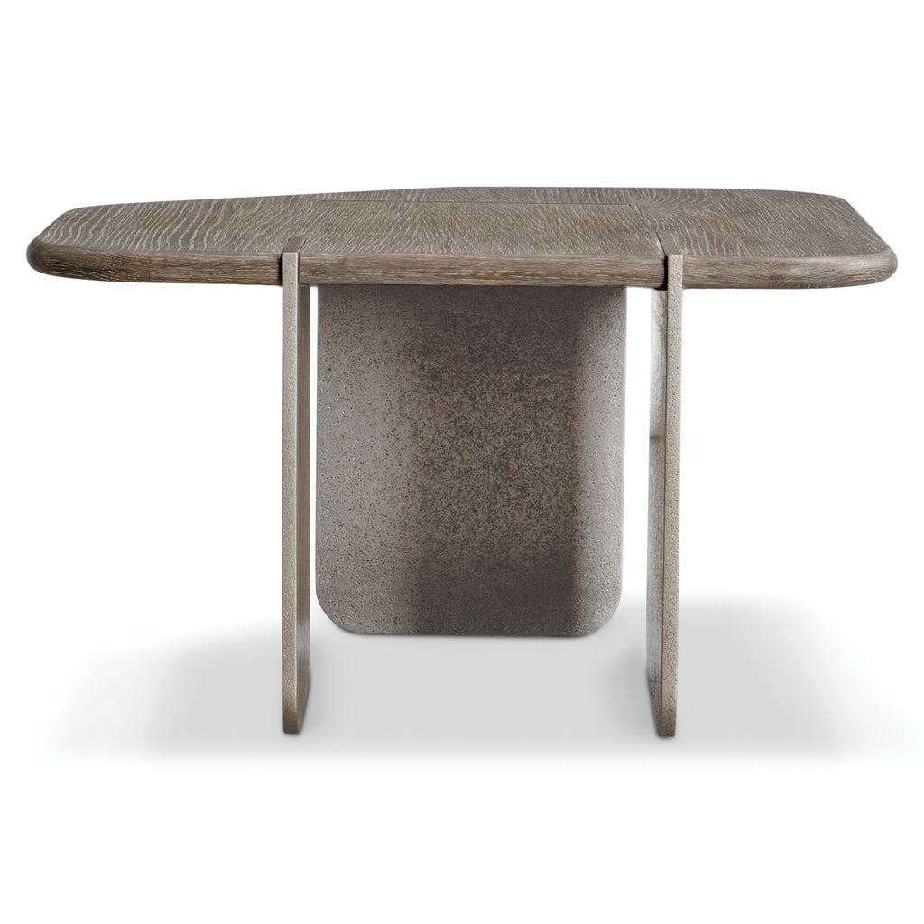 The Melba cocktail table finds itself at the perfect intersection between modern and rustic styles. Three textured cast aluminum panels finished in Graphite pierce the top. The uniquely shaped wood surface is wirebrushed for texture and finished in Puma.