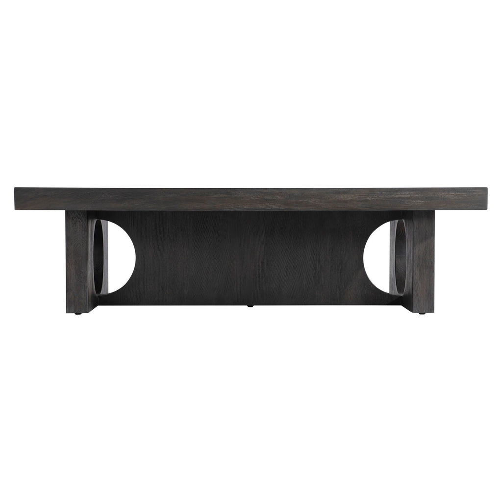 Circles and squares make the perfect shape in the Micah cocktail table. The sides offer open circles while the center panel meets the sides with its own half-circles at each end. Fashioned in a Black Truffle finish, the result is a stunningly modern geometric design.