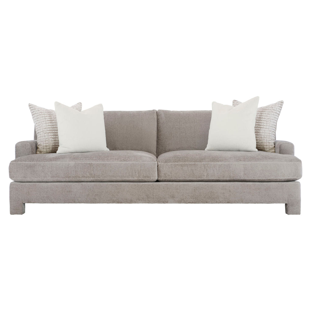 Fully upholstered from top to bottom, the Mily sofa brings a soft touch to the luxe living space. The modern design features a low-profile back and recessed track arms. Sumptuous feather down cushions offer luxurious comfort, while the combination of natural fabric and relaxed tailoring presents a serene, sophisticated look.