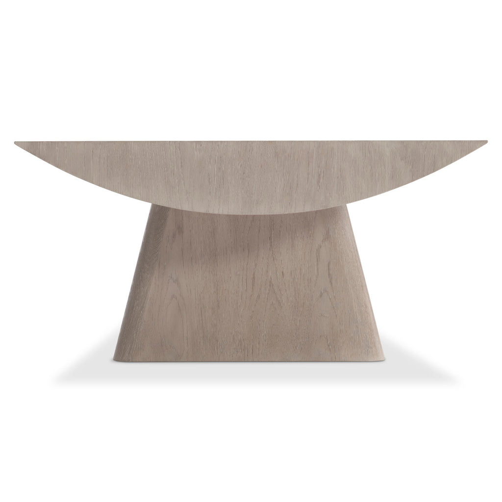 Japanese torii gates inspired the modern design for the Norden cocktail table. The top has a half-circle design with a flat surface. It is supported by trapezoid legs that pierce the top of the table. The light Larza finish adds to the quiet sophistication.