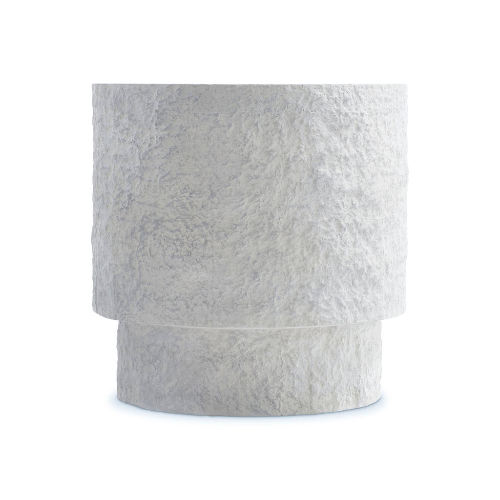 The Pincio side table takes a simple form and gives it a modern organic update. The round table is set on a plinth base and has a smooth top. The textured sides offer a faux stone look in the Millstone finish.