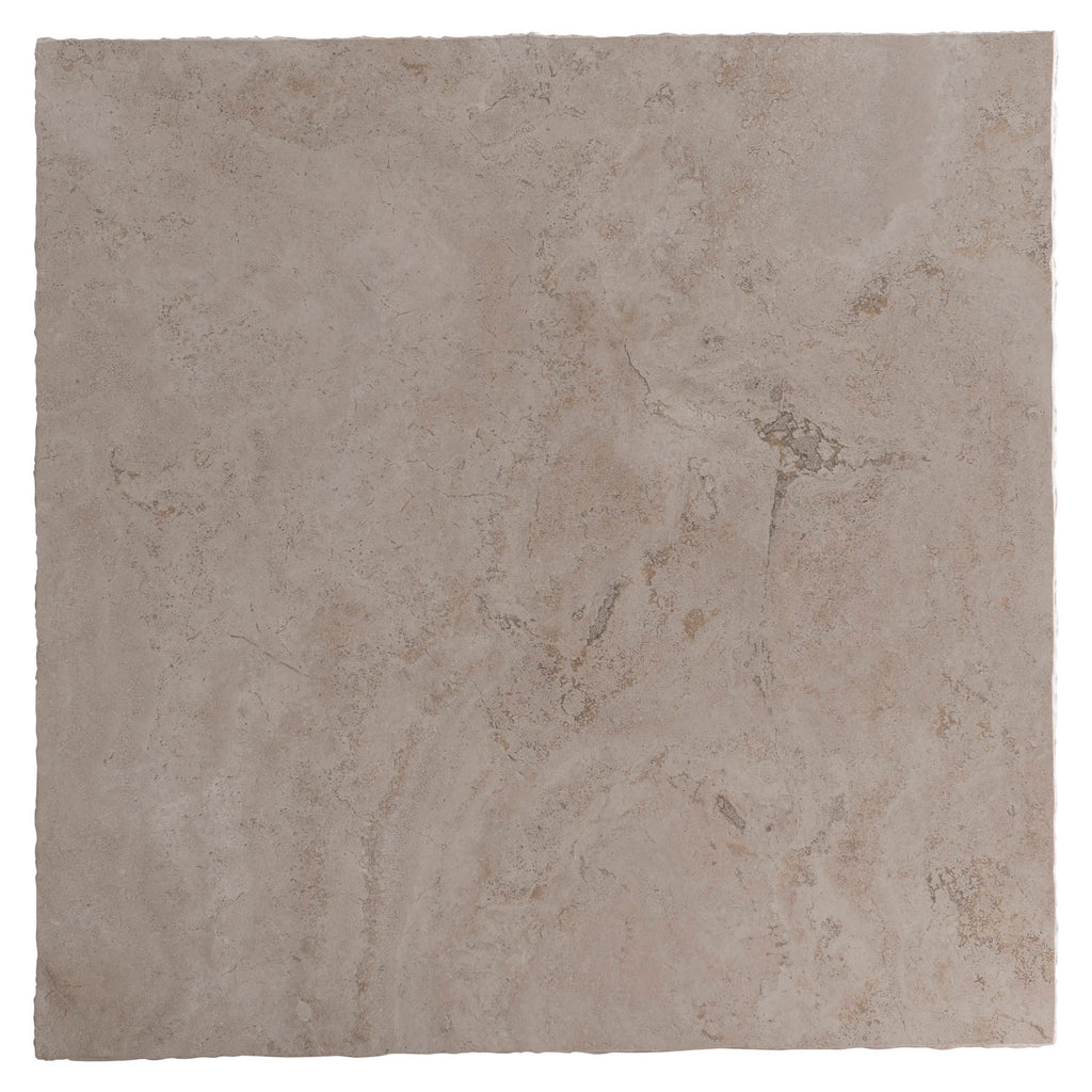 • Honed Bianco Travertine laminated stone top with chiseled edges.