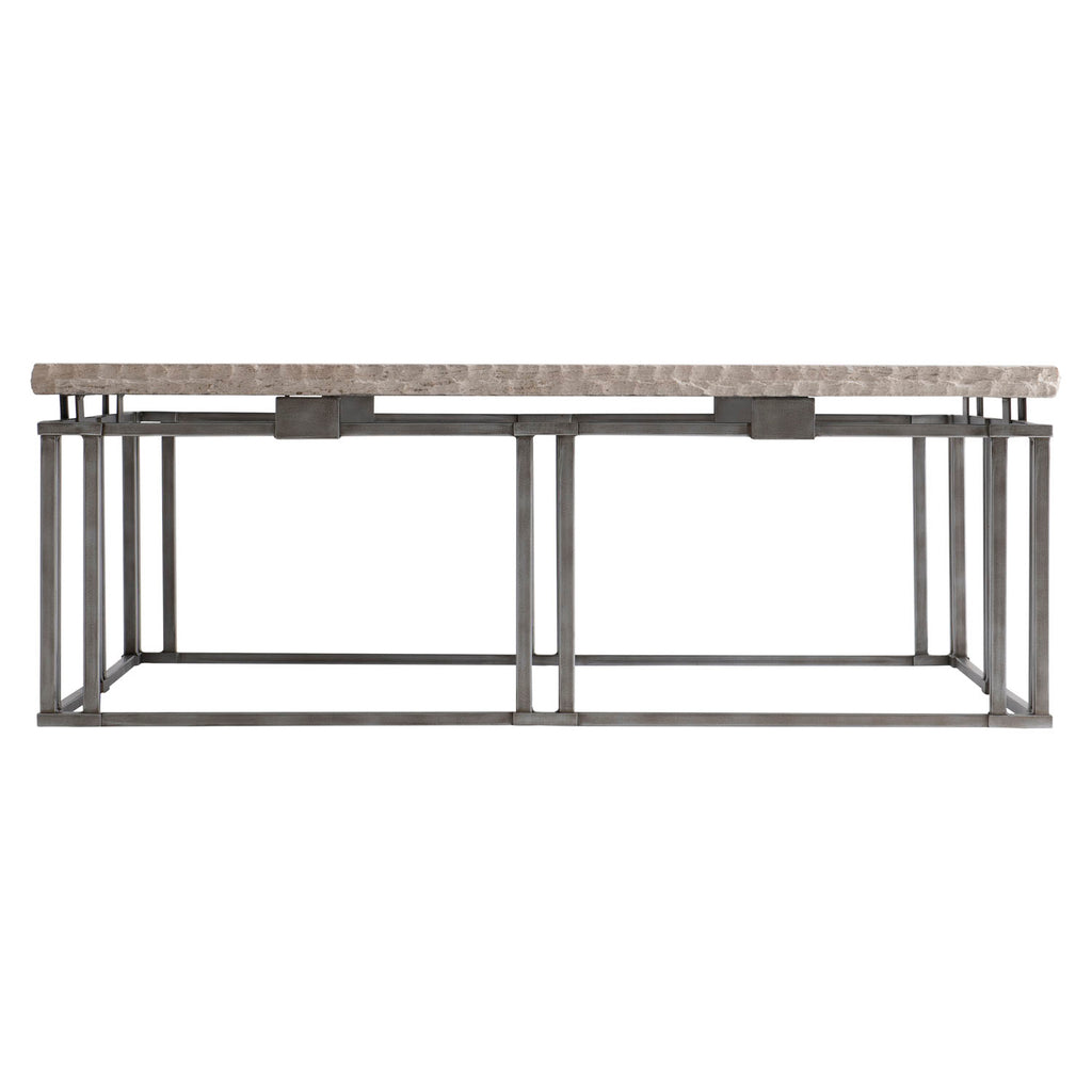 The Riverton cocktail table's design finds its inspiration in the Arts and Crafts period, with simple lines that celebrate form and style. Metal bars interlock for the base, allowing a honed Bianco Travertine laminated stone top to float above the frame.