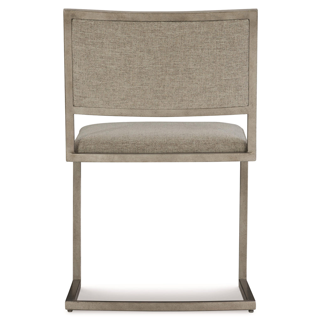 The Bernhardt Loft Ames metal side chair combines an eclectic urban aesthetic with hints of mid-century and farmhouse design. A contemporary version of the iconic tubular steel cantilever chair, it features a low-profile back and a glazed silver frame. The upholstered seat and half-back come in soft neutral fabric that blends seamlessly with the steel frame for a laid-back and sophisticated look.