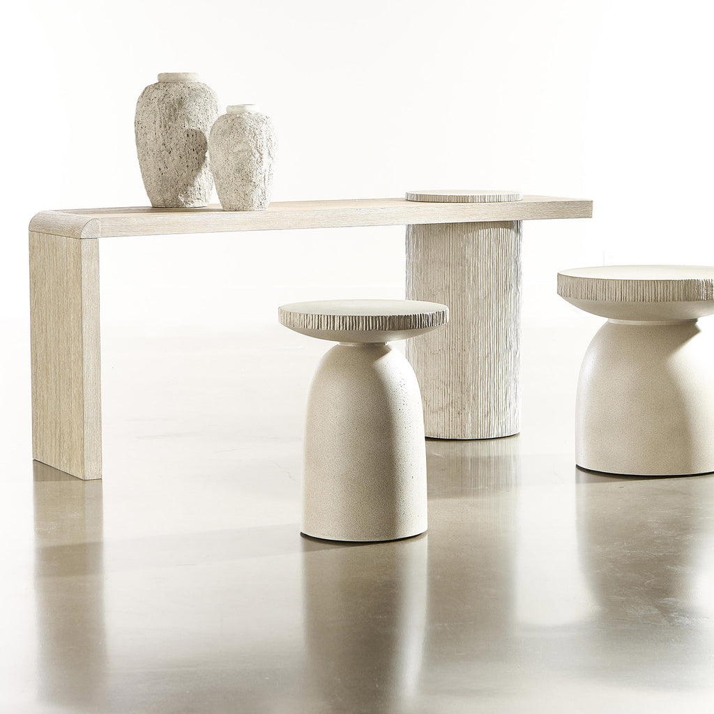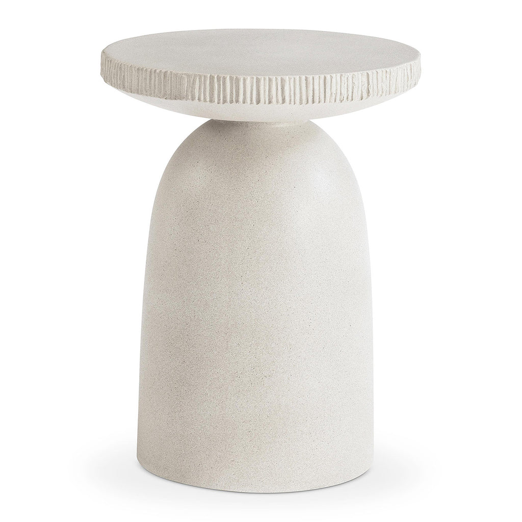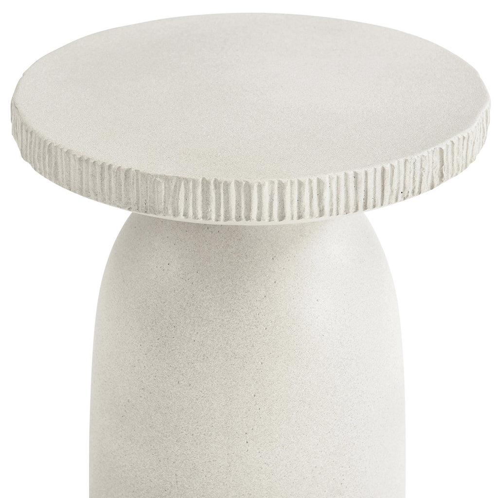 Molded from glass-reinforced concrete, the Antibes accent table has the sculptural style of a modern chess piece. Finished in Pumice, the base and top of the table are smooth and monolithic, with a textural band around the edge of the table’s top.