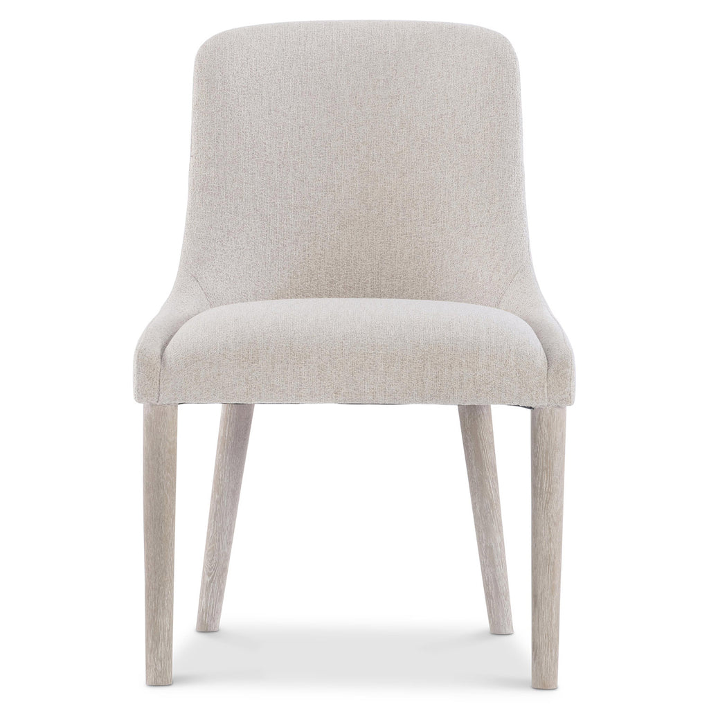 The rounded back on the Bernhardt Loft Antibes side chair curves its way down to form low-profile arms. The serenely modern design is complemented with round exposed wood legs in the Roz finish. It's a look that's both organic and elemental, fitting many dining room styles.
