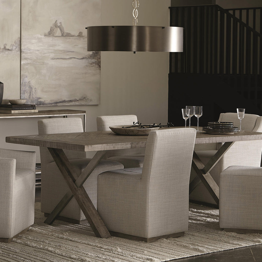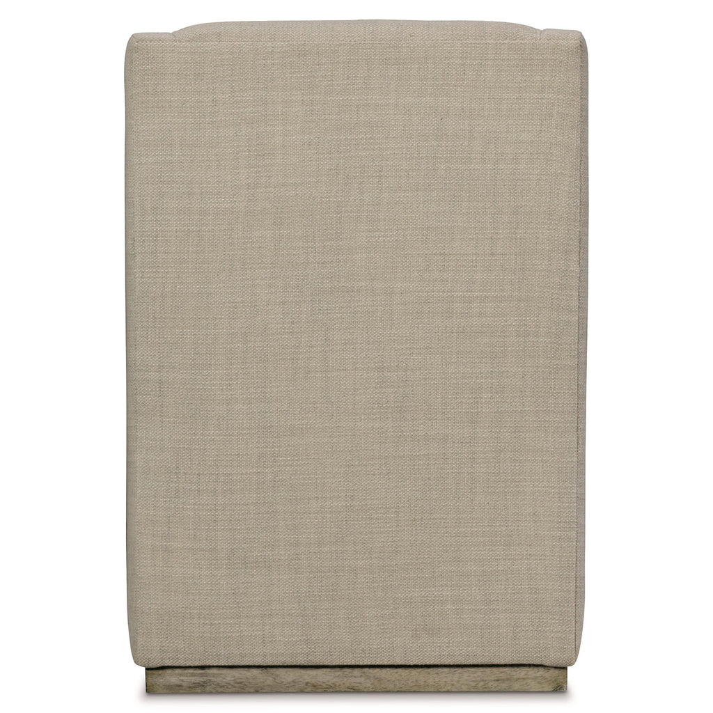 The Highland Park collection is intentionally eclectic, revealing hints of farmhouse and mid-century styling. The Casey arm chair showcases an elegant shape smoothly upholstered in soft neutral fabric with a stitched slipcover look. Sloped arms bring movement to its boxy form, while a wooden plinth base in Morel finish adds a rustic chic touch.