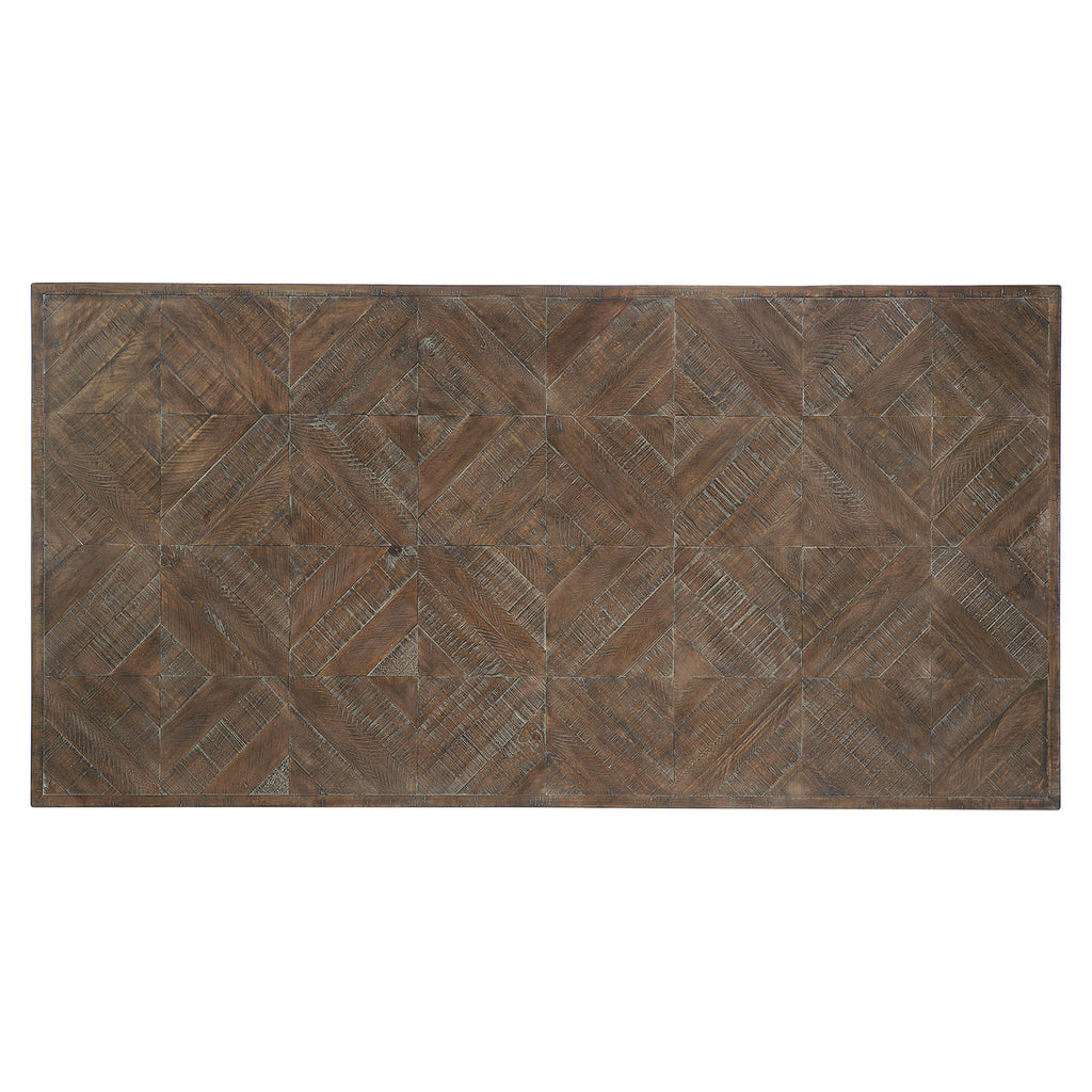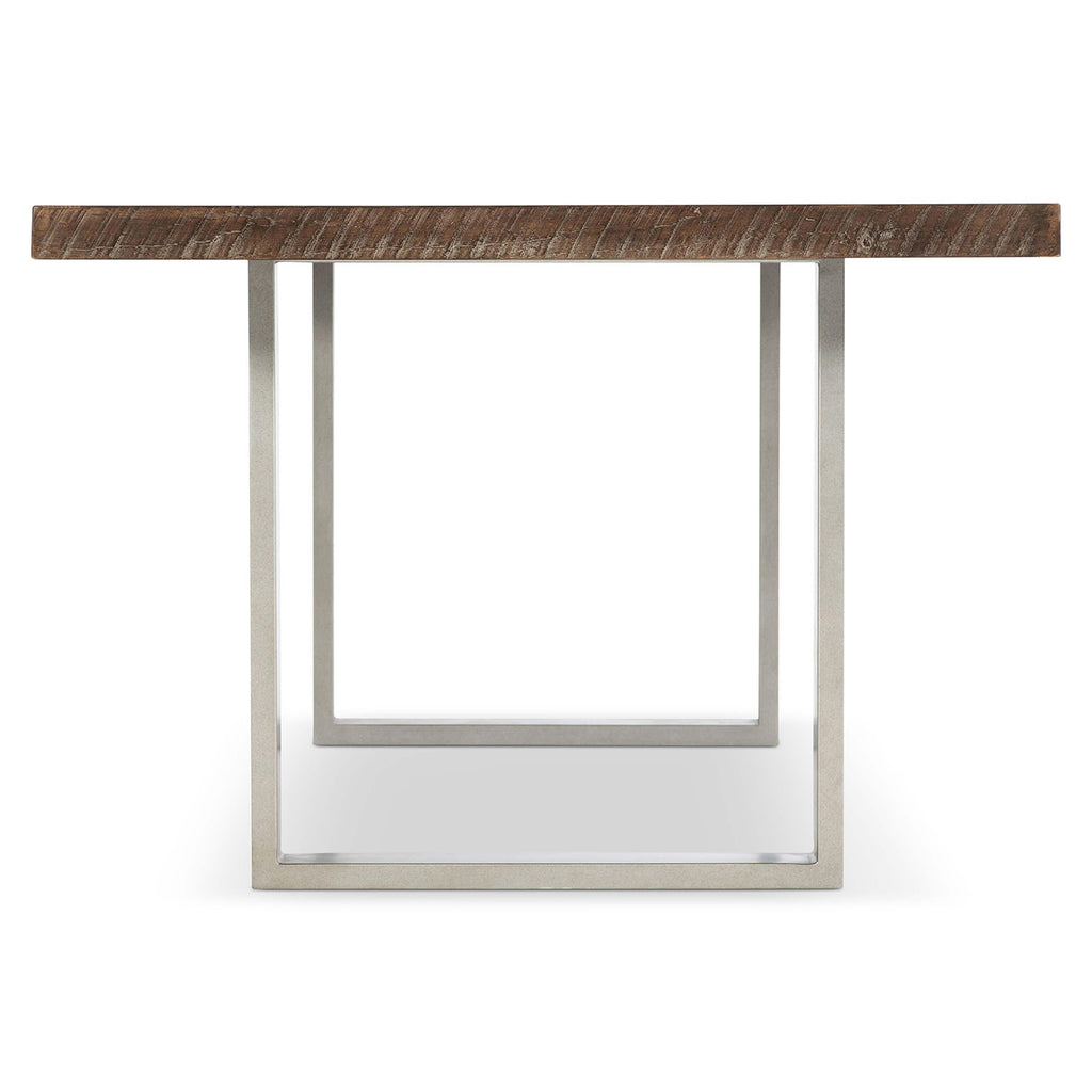 With its architectural structure and minimalist aesthetic, the Bernhardt Loft Draper dining table embodies urban sophistication. The fancy face tabletop is crafted from distressed pine finished in a moody Sable Brown that adds rustic texture. Two open tubular steel pedestals are finished in Gray Mist for a polished, industrial look. Casual in nature, this table brings a hip, edgy vibe to the luxe interior.