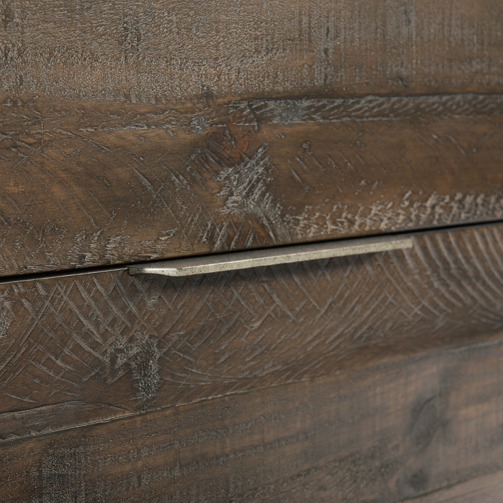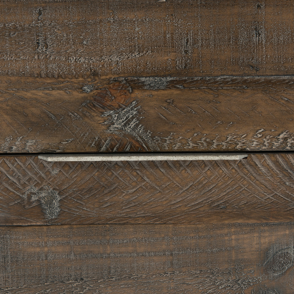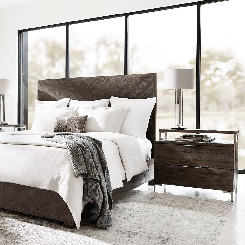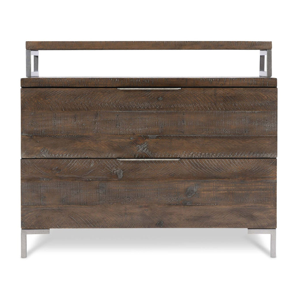 The Logan Square collection is casually sophisticated, combining modern minimalism with a cool retro sentiment and 70s revival style. The Haines Nightstand marries distressed pine with sleek metal for a rustic modern look. This classic piece brings casual style and ample storage to the bedroom with two drawers and a recessed, removable raised shelf. Tubular steel feet in a Gray Mist finish add a chic industrial detail.